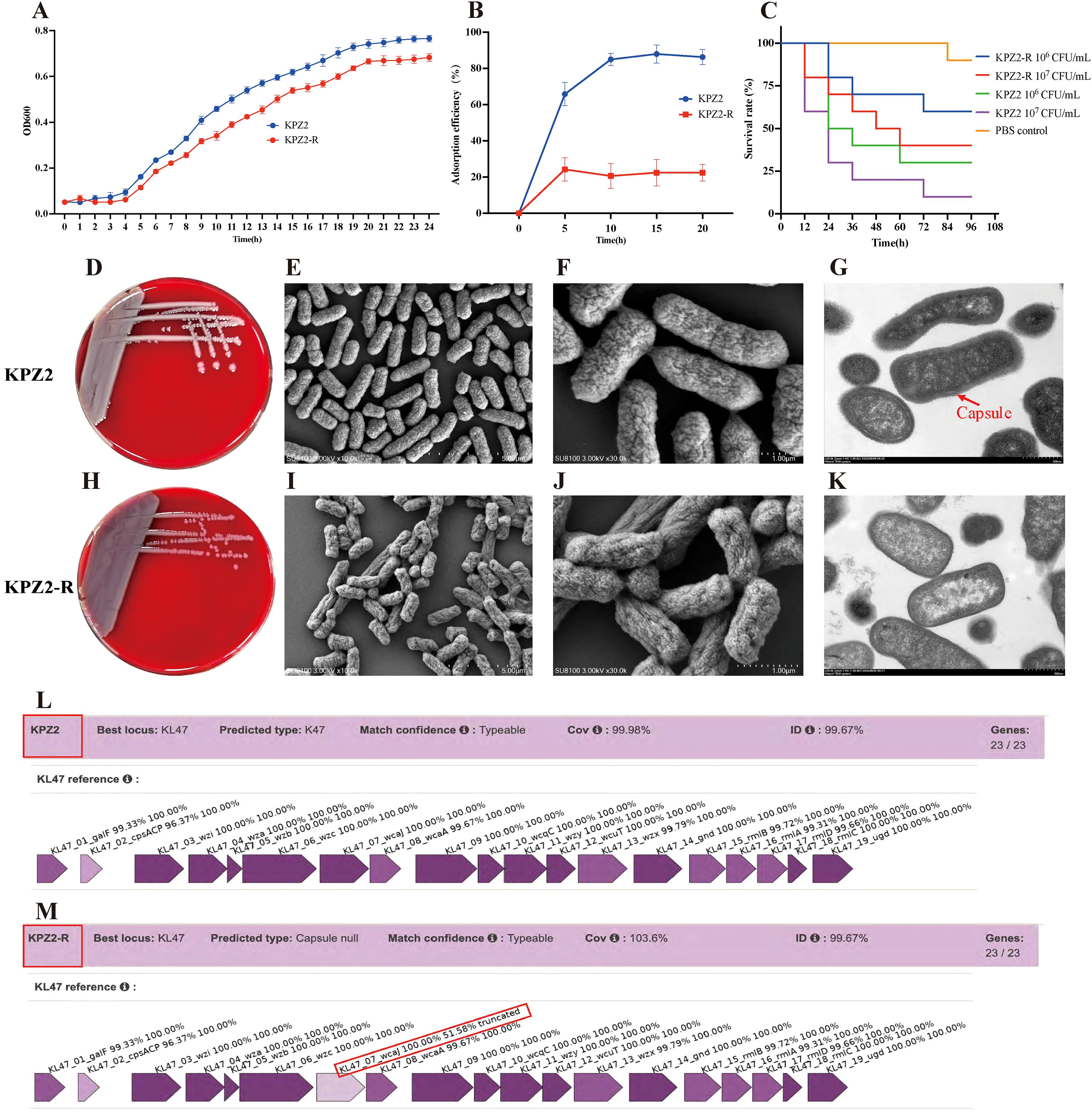 Figure 5. Characterization of phage-resistant strain KPZ2-R. (A) Growth curves of KPZ2 and KPZ2-R in LB broth measured by OD600, mean ± SD. (B) Comparison of adsorption efficiency between KPZ2 and KPZ2-R, mean ± SD. (C) Comparison of virulence between KPZ2 and KPZ2-R in the G.mellonella infection model. (D, H) Colony morphology of the strain KPZ2 and KPZ2-R on blood agar plates. (E, F, I, J) SEM images of KPZ2 (E, F) and KPZ2-R (I , J). KPZ2 showed a smooth, dense, and uniform surface with a thick structure. In contrast, KPZ2-R had a rough, uneven surface with wrinkles or depressions and a thinner structure, along with evident capsule defects. (G, K) TEM images of KPZ2 (G) and KPZ2-R (K). KPZ2 exhibited a well-defined, prominent capsule surrounding the cell, whereas KPZ2-R displayed a significantly reduced and poorly defined capsule. (L, M) Kaptive-based capsular locus analysis. Both strains matched the KL47 capsular type with 99.67% identity. KPZ2 showed complete locus coverage (99.98%) with intact capsule biosynthesis genes, while KPZ2-R was classified as “capsule null” due to a truncated wcaJ gene (51.58% identity).
