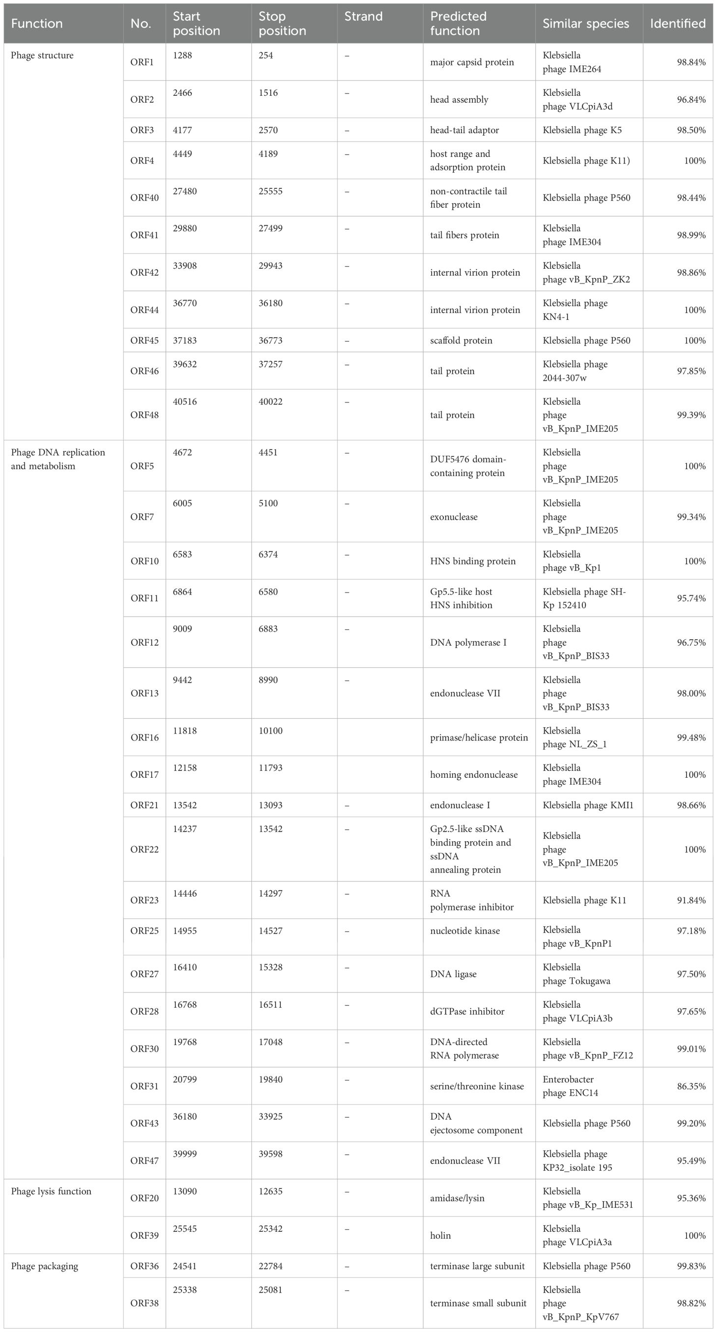 In recent years, CRKP has rapidly spread worldwide, resulting in high mortality rates and limited treatment options, and has become a serious public health concern (Karampatakis et al., 2023). Therefore, there is an urgent need to explore alternative therapeutic strategies (Chang et al., 2022). Amid the growing challenge of antimicrobial resistance, phage therapy has emerged as a promising antibacterial approach (Hatfull et al., 2022; Kou et al., 2024). Numerous preclinical studies and clinical case reports have demonstrated the therapeutic potential of phages in treating KP infections (Kou et al., 2024; Xing et al., 2025).