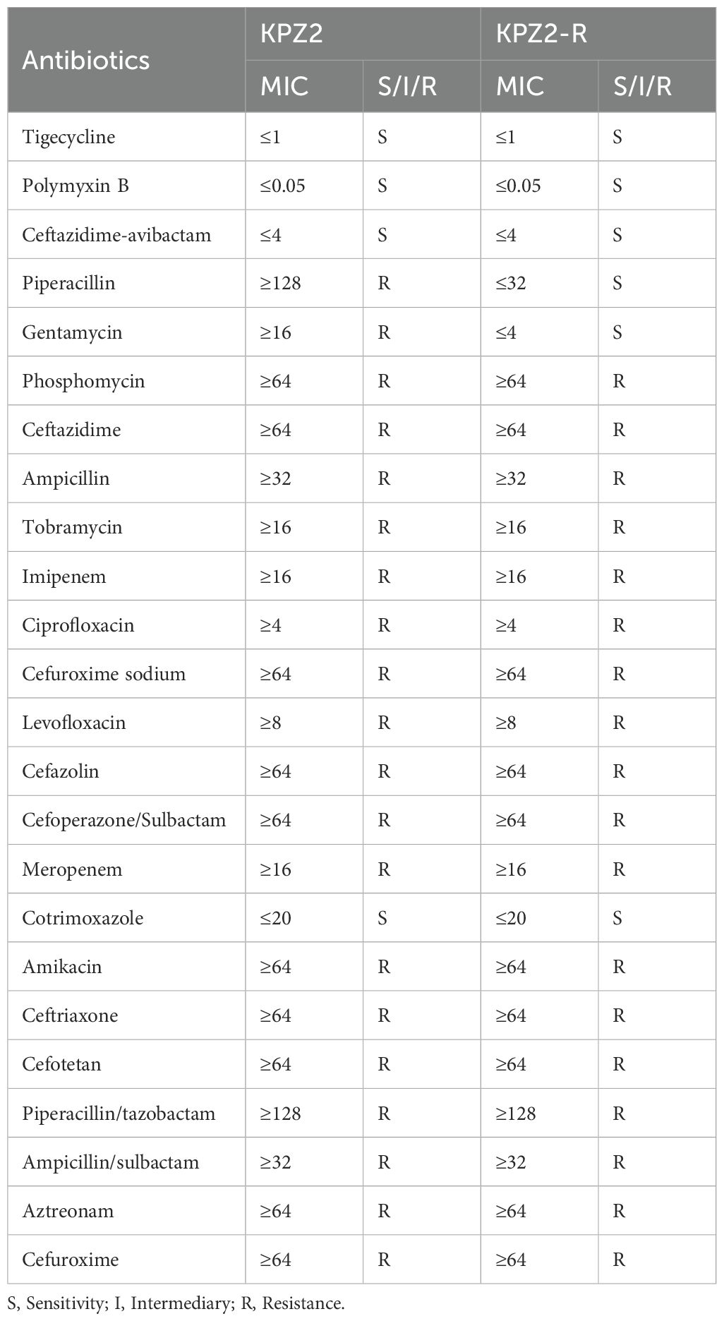 Antibiotic susceptibility of KPZ2 and KPZ2-R was determined using the VITEK-2 Compact system (BioMérieux, France). The KPZ2 and KPZ2-R were standardized to a 0.5 McFarland scale. The prepared bacterial suspension was loaded along with the AST-GN card into the VITEK-2 Compact system for automatic inoculation and determination. The results were analyzed following the guidelines of the Clinical and Laboratory Standards Institute (CLSI).