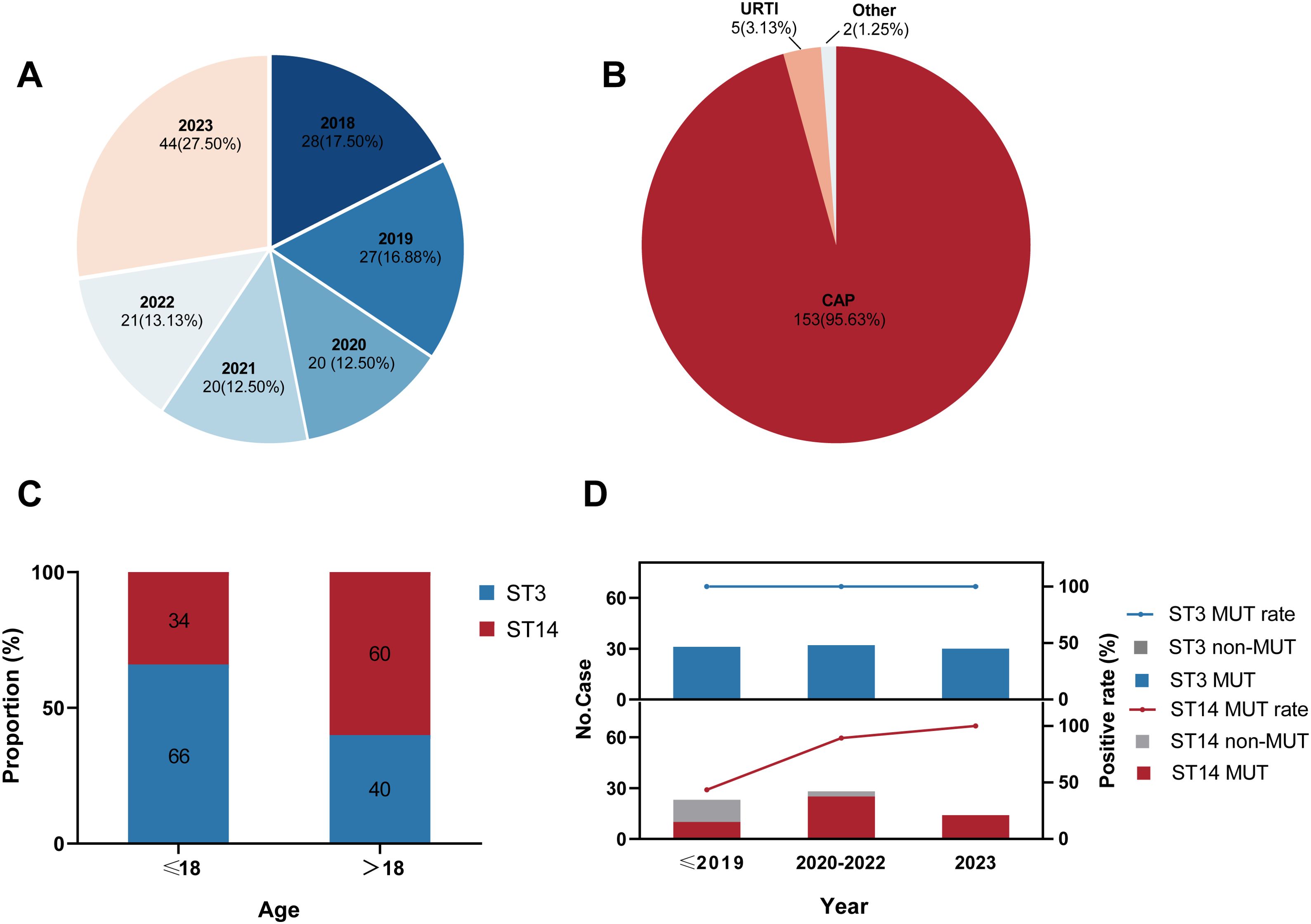 Figure 1. Characteristics of 160 Mycoplasma pneumoniae strains included in this study. (A) Distribution of the collection years. (B) Distribution of the patients’ clinical symptoms. CAP: community-acquired pneumonia; URTI: upper respiratory-tract infection. (C) ST distribution in different age groups. ST: sequence type. (D) Macrolide-resistance mutations in 23S rRNA among strains by ST. MUT: macrolide-resistance mutation in the 23S rRNA gene.
