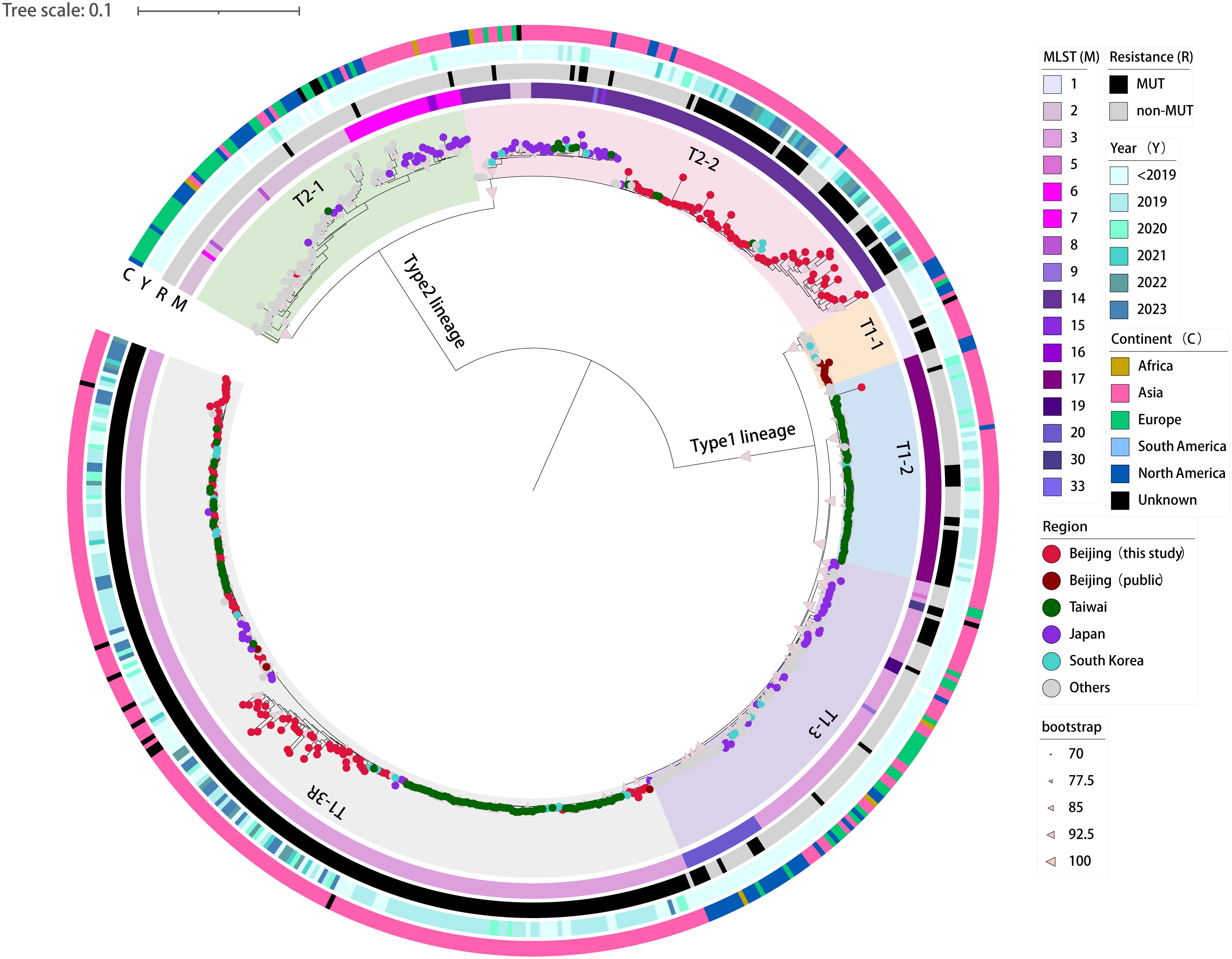 Based on the 5707 SNPs present in the core genomes, we constructed a genome-wide phylogenetic tree of the 590 M. pneumoniae strains, including 160 strains from this study and 430 global genomes available from public database (Figure 2; Supplementary Figure S1). As expected, the phylogeny of M. pneumoniae formed two major clades in accordance with the P1 typing and could be further divided into six subclades, consistent with previous results (Hsieh et al., 2022; Kenri et al., 2023; Kubota et al., 2025). The p1-type 1 clade was divided into four subclades T1-1, T1-2, T1–3 and T1-3R, and the p1-type 2 clade into subclades T2–1 and T2-2. In general, the STs of the 590 strains were consistent with the phylogenetic groups. Subclades T1-1, T1–2 and T1-3R consisted solely of ST1, ST17 and ST3 strains, respectively. However, the large subclades always included multiple STs. Major ST of Subclade T1–3 was ST3 with ST5, ST9, ST19, ST20, and ST30. Subclade T2–1 consisted of ST2, ST6, ST7, ST8, and ST16. Subclade T2–2 showed a high proportion of ST14 strains followed by ST2, ST15, and ST33.