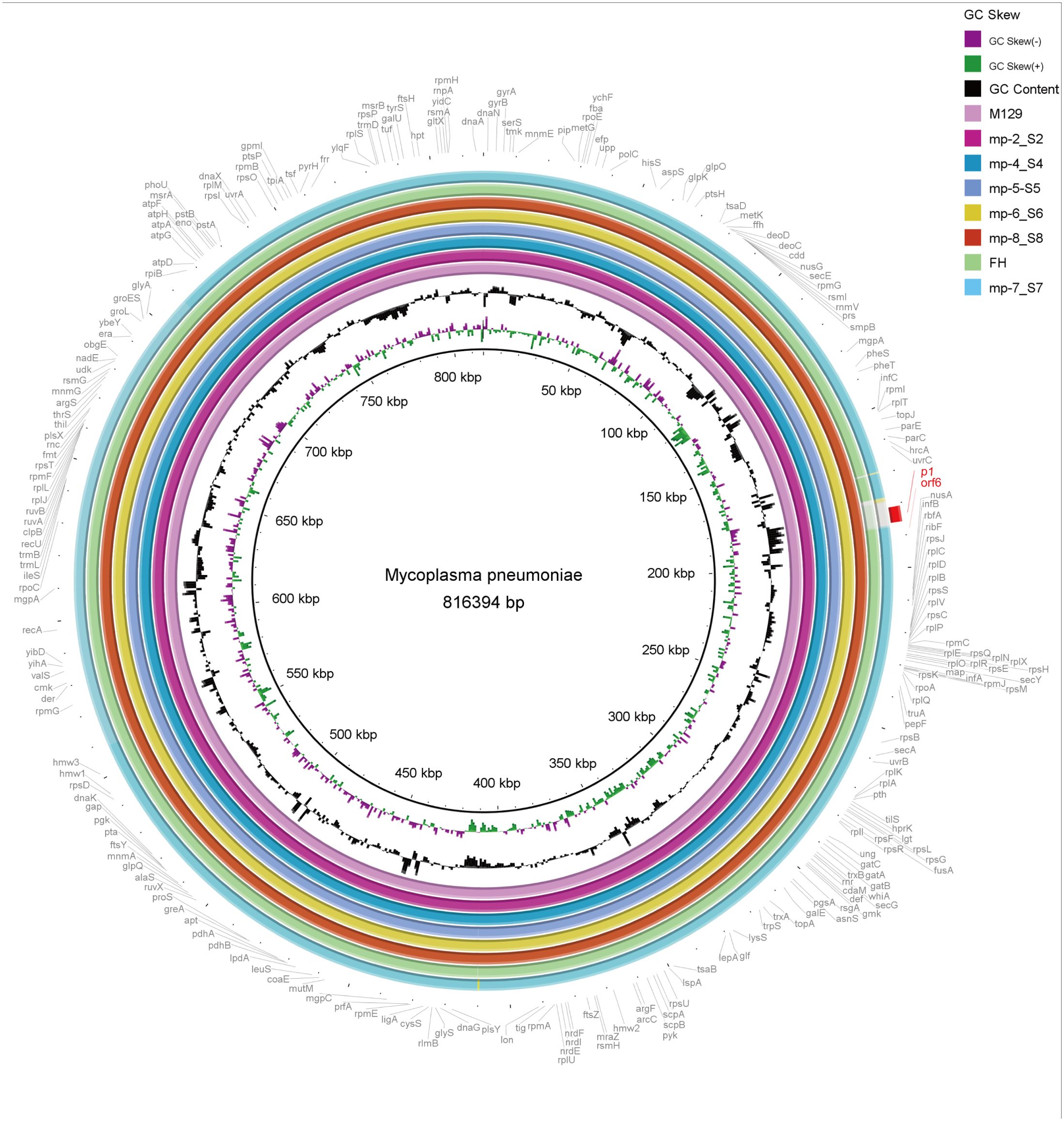The 6 completed genomes of Beijing representative strains were aligned using a variety of methods. To determine their overall similarity, the genomes were aligned to the reference M129 genome using BRIG, a BLAST-based alignment method. Overall, the genomes were 99% to > 99% identical. The similarity dropped to approximately 95% in the type 2 strains, where the p1 gene (MPN141) and the orf6 gene (MPN142) harbored (Figure 3).