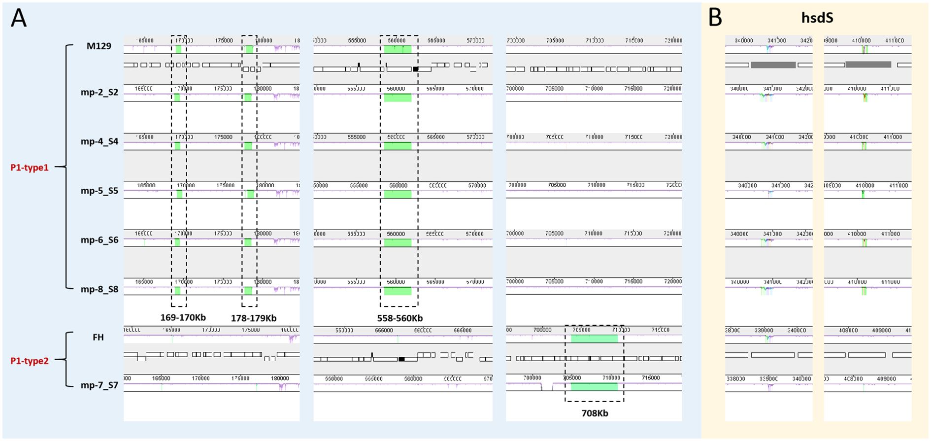 Figure 4. Whole genome alignment of the 6 sequenced strains with 2 reference sequences using MAUVE. Regions no-colored in MAUVE are conserved across all strains. Differently colored blocks are conserved in some strains. Open boxes indicate the location of genes. All positions and annotations are based on M129 strain. M129 and FH are typical strains of type 1 and 2, respectively. (A) Close up of 4 subtype-specific insertions. (B) Close up of non-conserved structural regions within hsdS genes (mpn285 and mpn289). hsdS: type I restriction-enzyme-like protein S subunit.