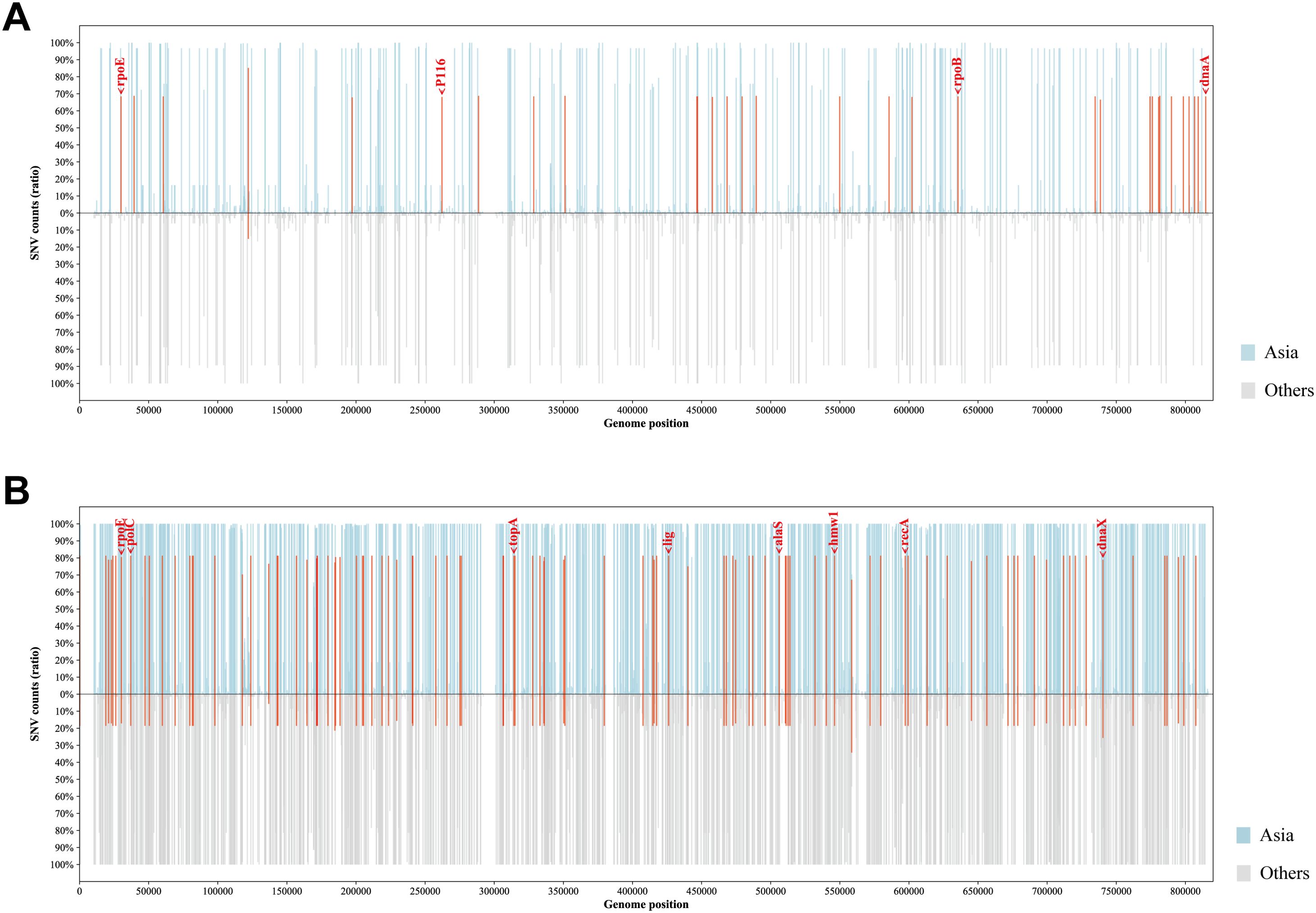 Figure 5. Profiles of Asia-dominant SNPs. The proportion and genomic distribution of all SNP in p1-type 1 strains (A) and p1-type 2 strains (B). In the top plot, the proportions of SNPs in Asian strains at each position are plotted as a light blue bar graph; and in the bottom plot, those in strains from other regions of the world are plotted as a light gray bar graph. Positions of Asia-region-dominant SNPs are indicated in red.