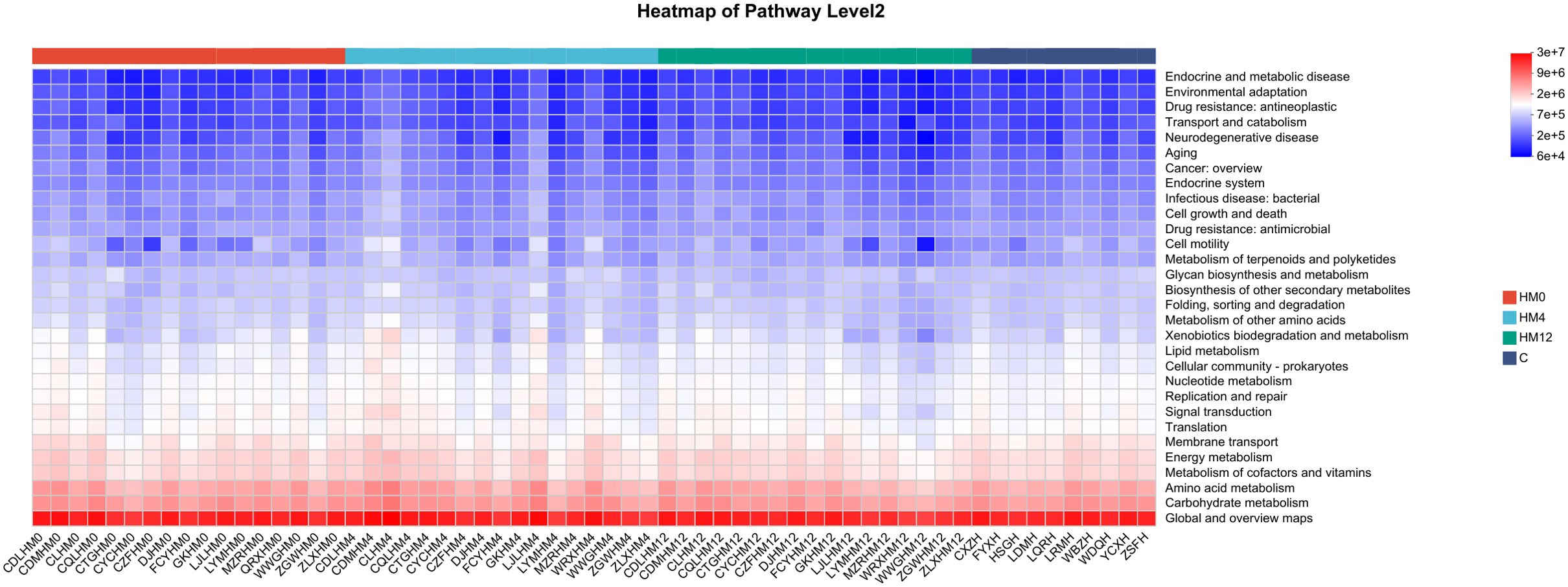 Heatmap titled “Heatmap of Pathway Level 2” showing the intensity of various biological pathways across different conditions. The color scale ranges from red to blue, indicating values from higher to lower. Pathways like “Endocrine and metabolic disease” and “Environmental adaptation” are listed. Columns are labeled with groups like “HM0,” “HM4,” “HM12,” and “C,” representing different experimental conditions. Each square's color reflects the data value for a specific pathway and condition.