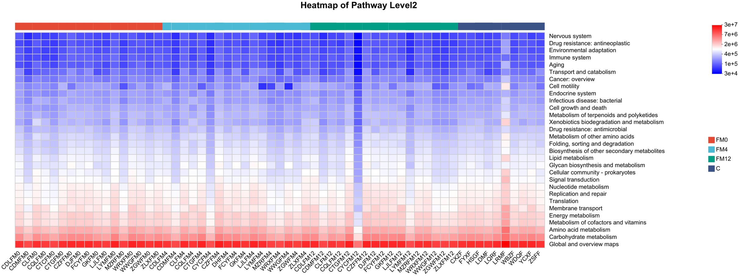 Heatmap titled “Pathway Level 2” showing cellular and metabolic pathways. Rows represent pathways such as the nervous system and immune system. Columns marked FM0, FM4, FM12, and C show sample groups. Colors range from red, indicating high activity, to blue, indicating low activity. A legend correlates color intensity with data values.