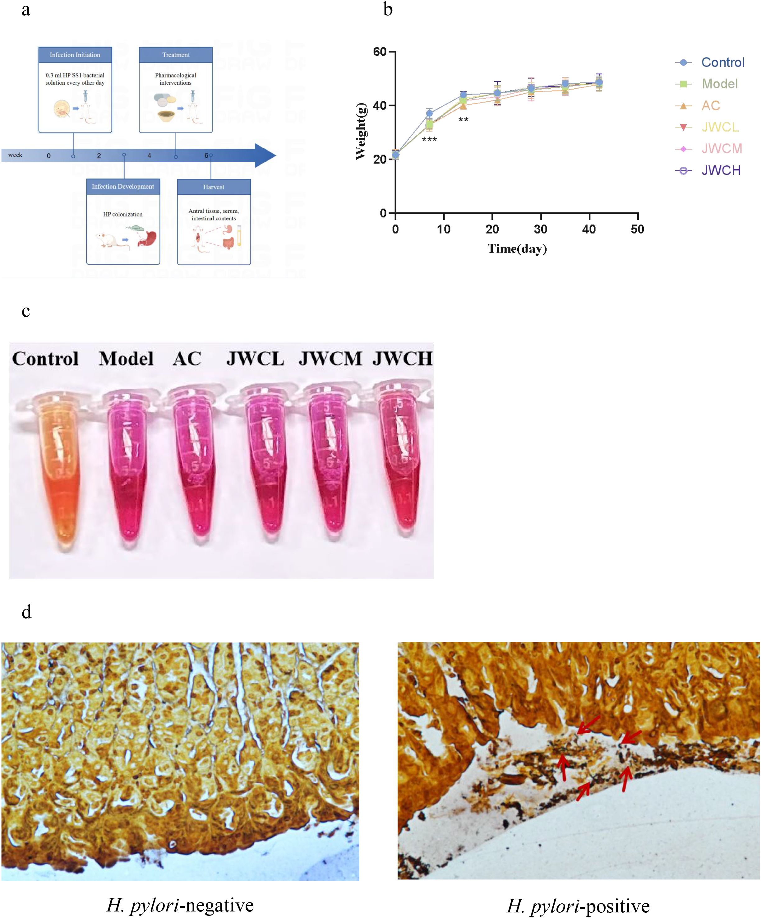 Figure 1. Animal treatment and model determination. (a) Flow chart of modeling and drug intervention. (b) Changes in body weight of mice during modeling and drug intervention. (c) RUT. The solution turning red indicated the presence of H. pylori infection. (d) WS. The red arrow indicated H. pylori colonized in the gastric mucosa.