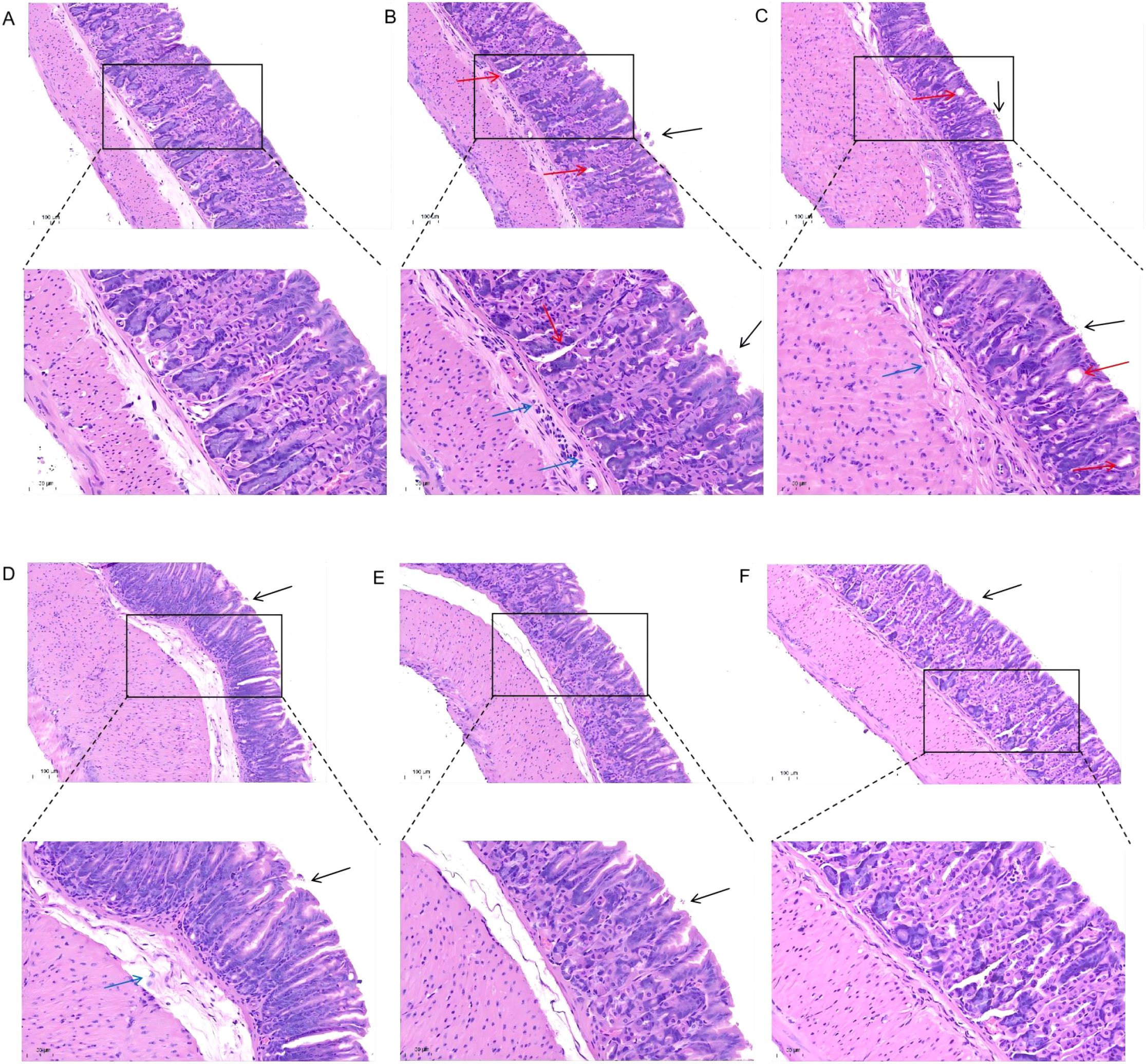 Figure 2. H&E staining to observe the effect of JWC on gastric mucosal damage in mice. (A) Control group. (B) Model group. (C) AC triple group. (D) JWCL group. (E) JWCM group. (F) JWCH group. epithelial cell exfoliation (black arrows), mild dilation of gastric glands (red arrows), and inflammatory cell infiltration (blue arrows). (20× magnification, scale bar 100 µm; 40× magnification, scale bar 50 µm).