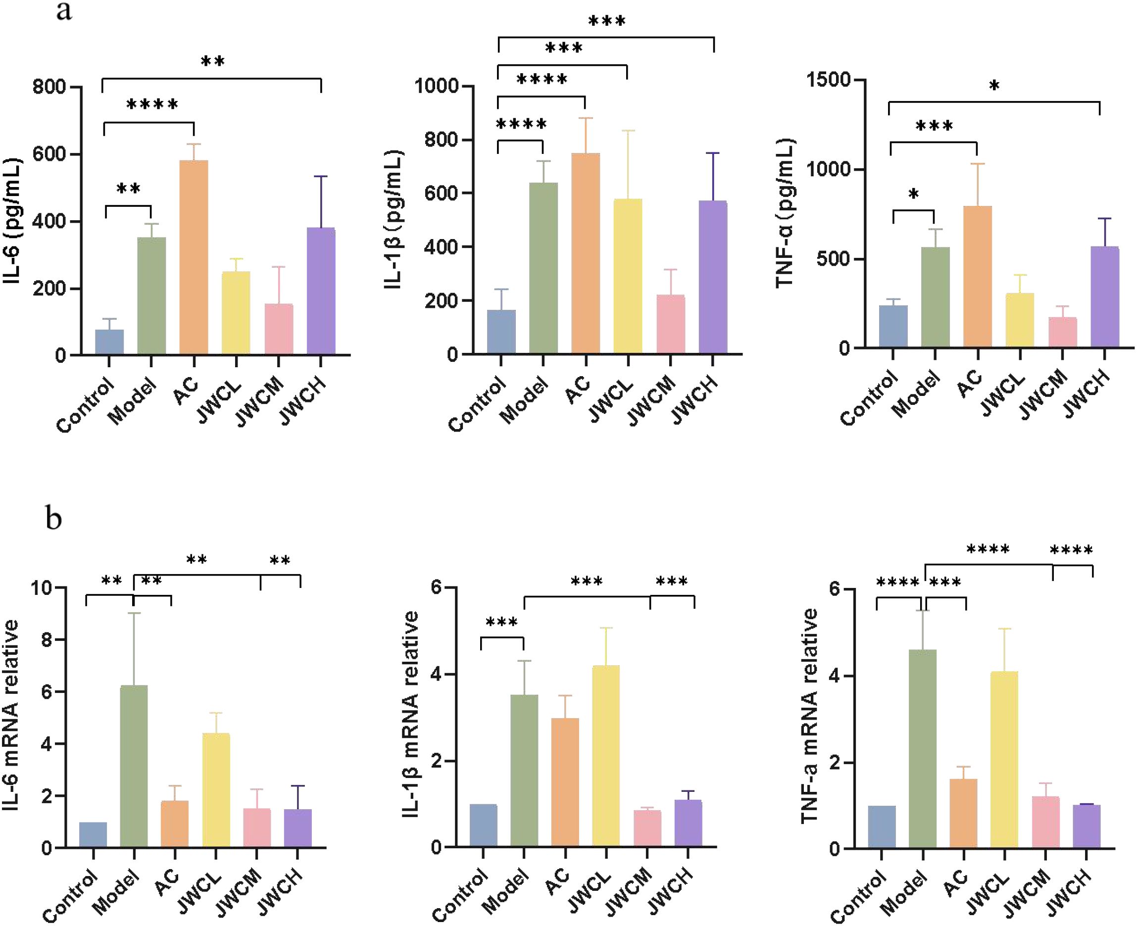 Figure 3. JWC regulated the expression of inflammation factors in gastric sinus tissues of (H) pylori infected mice. (a) The contents of IL-6, IL-1β and TNF-α. (b) The mRNA expression level of IL-6, IL-1β and TNF -α. The results of each experiment are the mean ± standard deviation of three independent experiments, *P < 0.05, **P < 0.01, ***P < 0.001, ****P < 0.0001.