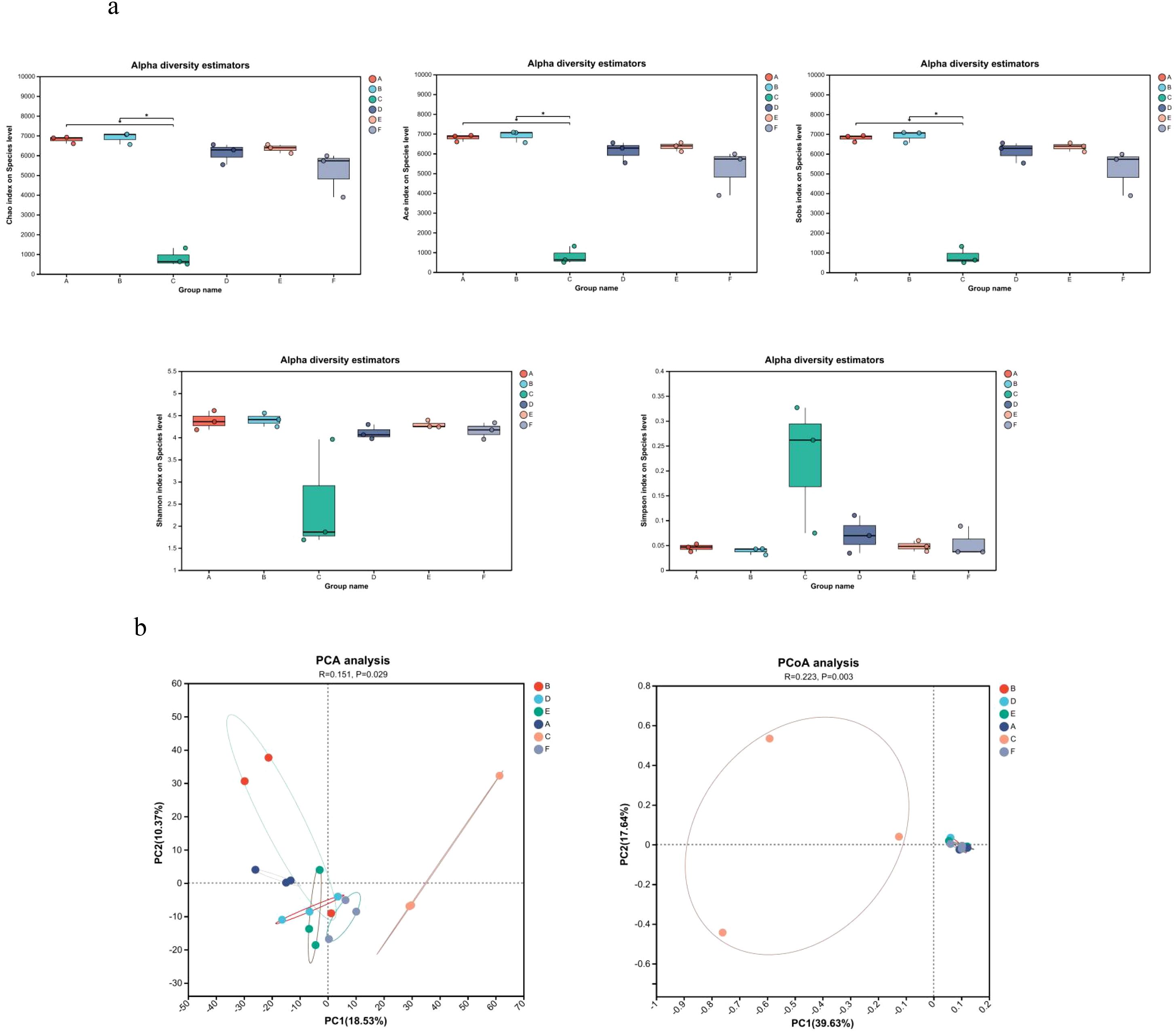 Figure 4. Microbial diversity analysis. (a) Microbial α diversity analysis. Chao index difference analysis, Ace index difference analysis, Sobs index difference analysis, Shannon index difference analysis and Simpson index difference analysis. (b) Microbial β diversity analysis. PCA analysis and PCoA analysis. A, Control group; B, Model group; C, AC triple group; D, JWCL group; E, JWCM group; F, JWCH group. *P < 0.05.