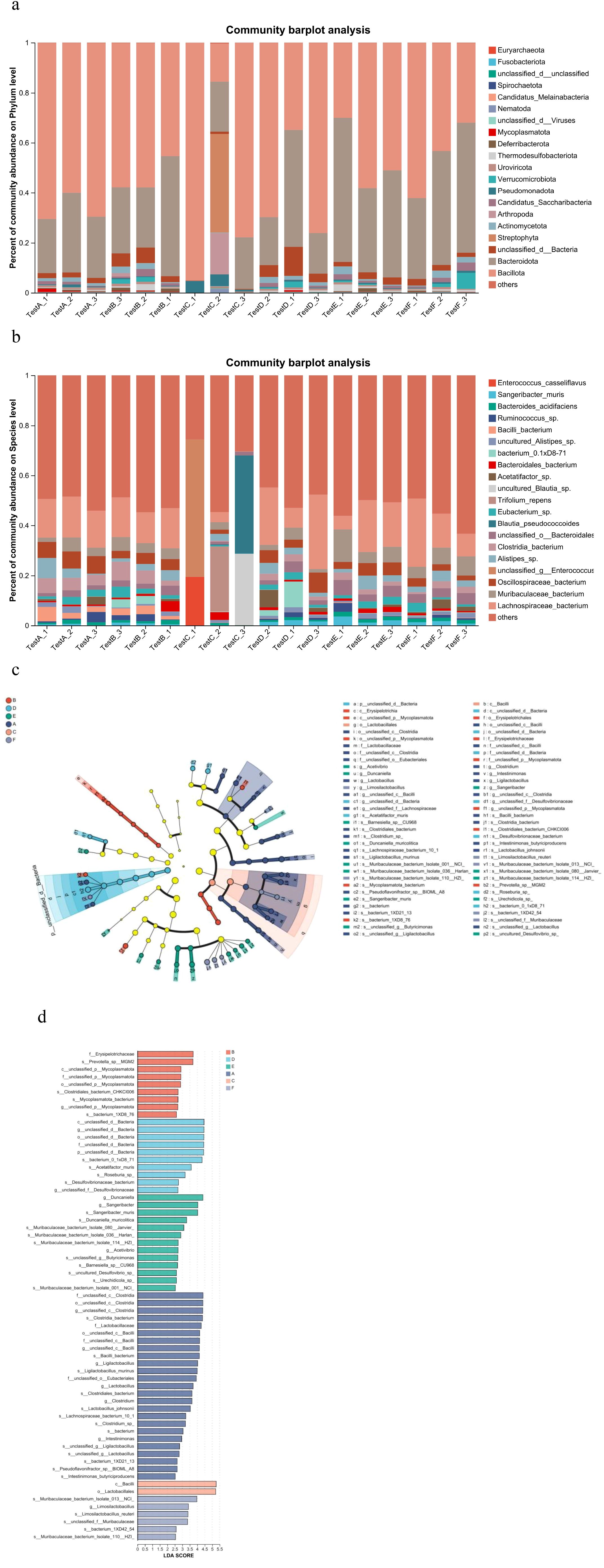 Figure 5. Analysis of microbial composition and difference. (a) Relative abundance of microorganisms at the phylum level. X-axis: Sample names. The labels testA-1, testA-2, and testA-3 correspond to the individual samples in Group (A) Y-axis: Relative abundance of species. Each colored segment in the bar plot represents a different species, and its length denotes the proportion of that species in the sample. (b) Relative abundance of microorganisms at the species level. X-axis: Sample names. Y-axis: Relative abundance of species. Each colored segment in the bar plot represents a different species, and its length denotes the proportion of that species in the sample. (c) LEFSe multi-species hierarchical tree. Statistical analyses were performed only from the phylum to the species level. Nodes of different colors represented microbiomes significantly enriched in the corresponding group. The diameter of each circle was proportional to the abundance of the group. Yellow nodes indicated microbiomes that were not significantly different between groups. (d) LDA discrimination result map (LDA score>2.5). A, Control group; B, Model group; C, AC triple group; D, JWCL group; E, JWCM group; F, JWCH group.