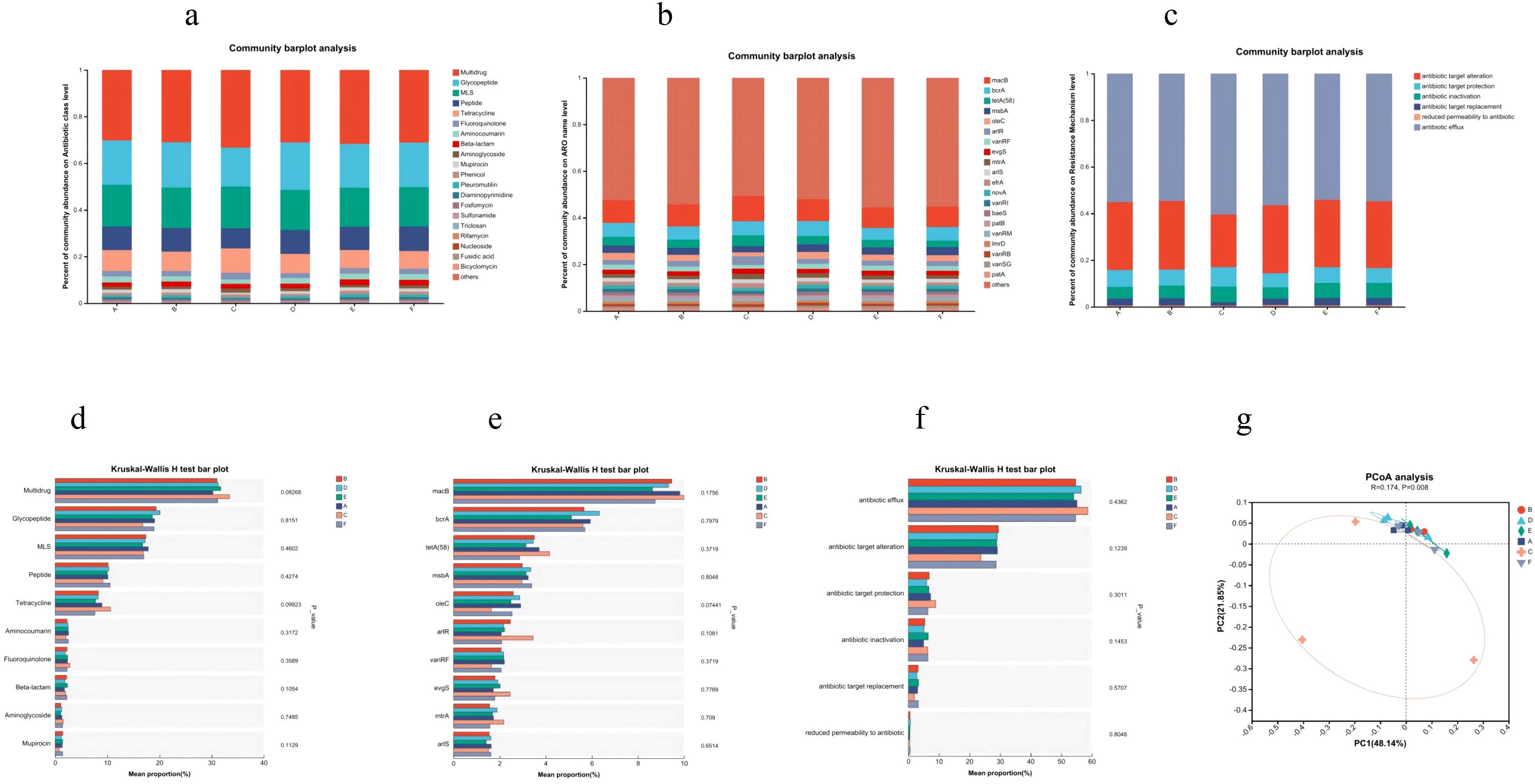Figure 6. CARD results. (a) Distribution of antibiotic classes in the top 20 of abundance. (b) Distribution of the top 20 AROs in abundance. (c) Distribution of major resistance mechanisms. (d) Antibiotic class analysis of variance. (e) ARO Difference analysis. (f) Resistance mechanism difference analysis. (g) PCoA analysis. A, Control group; B, Model group; C, AC triple group; D, JWCL group; E, JWCM group; F, JWCH group.