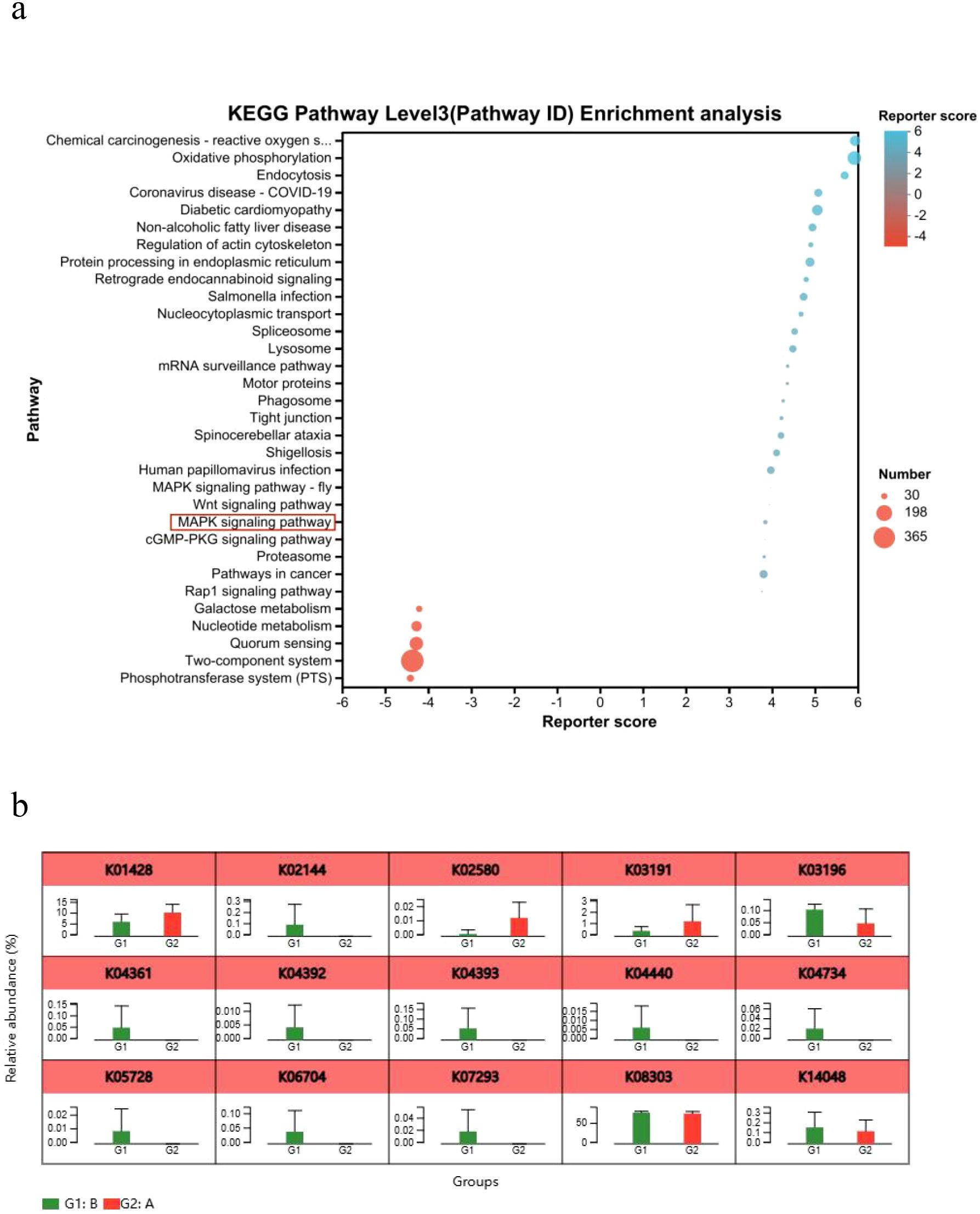 Figure 7. KEGG pathway enrichment analysis. (a) Bubble plot of KEGG functional enrichment analysis. (b) Analysis of relative gene abundance of key enzymes in the epithelial cell signaling pathway in H. pylori infection. A, Control group; B, Model group; *P < 0.05, **P < 0.01.