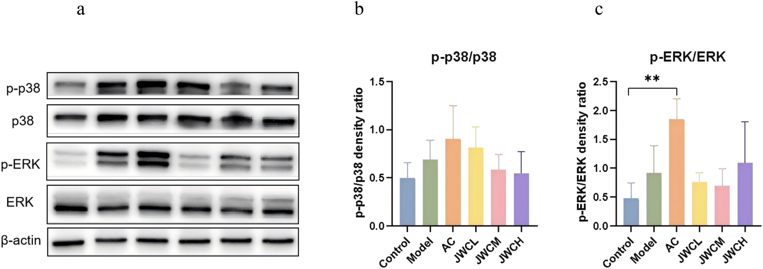 Figure 8. JWC regulated the expressions of MAPK pathway proteins in (H) pylori-infected mice. (a) WB detection of p38, p-p38, ERK, p-ERK expression. (b) Relative expression of p-p38/p38. (c) Relative expression of p-ERK/ERK. Results of each experiment are the mean ± standard deviation of three independent experiments, *P < 0.05, **P < 0.01.