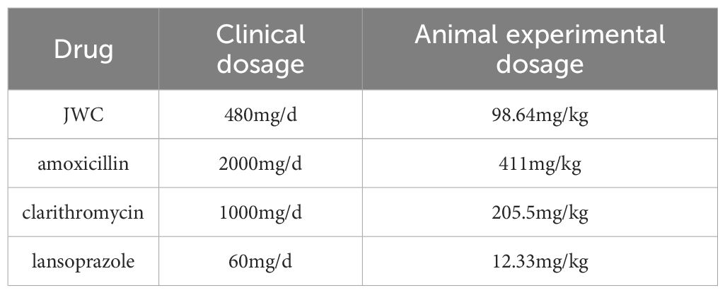 The standard H. pylori strain SS1, which is positive for both the cytotoxin-associated gene A (CagA) and the vacuolating cytotoxin A (VacA), generously provided by the Department of Gastroenterology at Peking University First Hospital, was preserved at −80°C in a low-temperature freezer. The cryopreservation solution was formulated using Brain Heart Infusion (OXOID, Basingstoke, UK) in conjunction with glycerol (Solarbio, Beijing, China). The bacterial suspension was inoculated onto Columbia blood agar plates (OXOID, Basingstoke, UK) enriched with 8% sheep blood (LABLEAD, Beijing, China) and incubated under microaerophilic conditions (85% N2, 10% CO2, and 5% O2) at 37°C for 48–72 h (Lin et al., 2024). Subsequently, the positive colonies were subcultured. The bacteria were collected in Brucella broth (BD, Franklin Lakes, NJ, USA) before intragastric administration.
