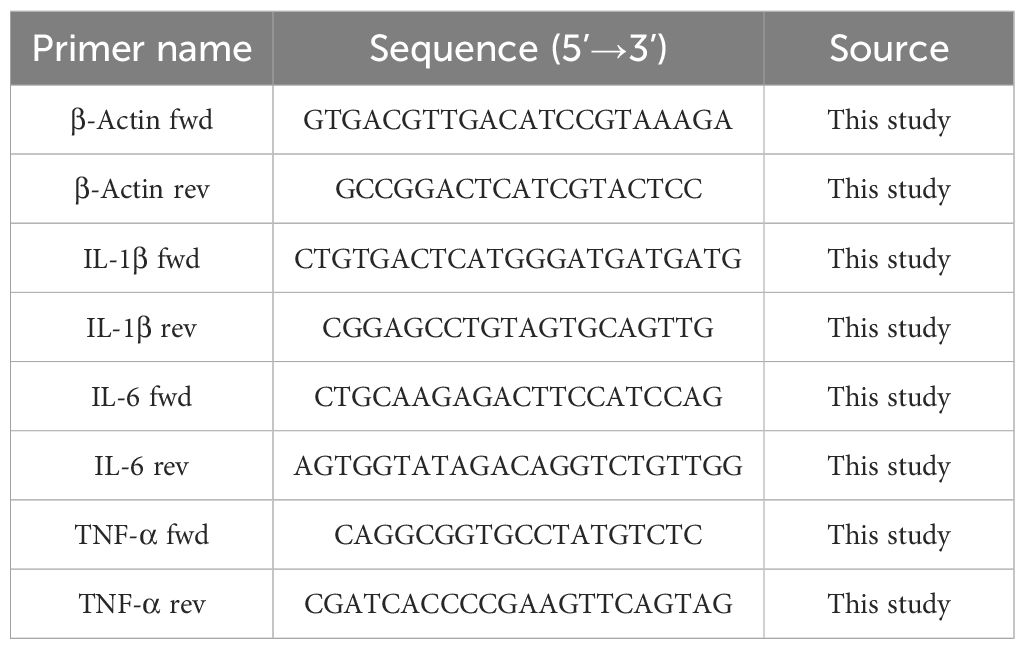 RNA was extracted from the gastric antral tissue of mice using TRIzol reagent. Following the determination of the RNA concentration, complementary DNA (cDNA) was synthesized using a cDNA Synthesis Kit (Takara, Japan). The relative expression levels of mRNA were quantified employing the 2−△△Ct method (Chu et al., 2022). The primer sequences utilized for quantitative reverse transcription PCR (qRT-PCR) are presented in Table 2. β-Actin served as the reference gene.