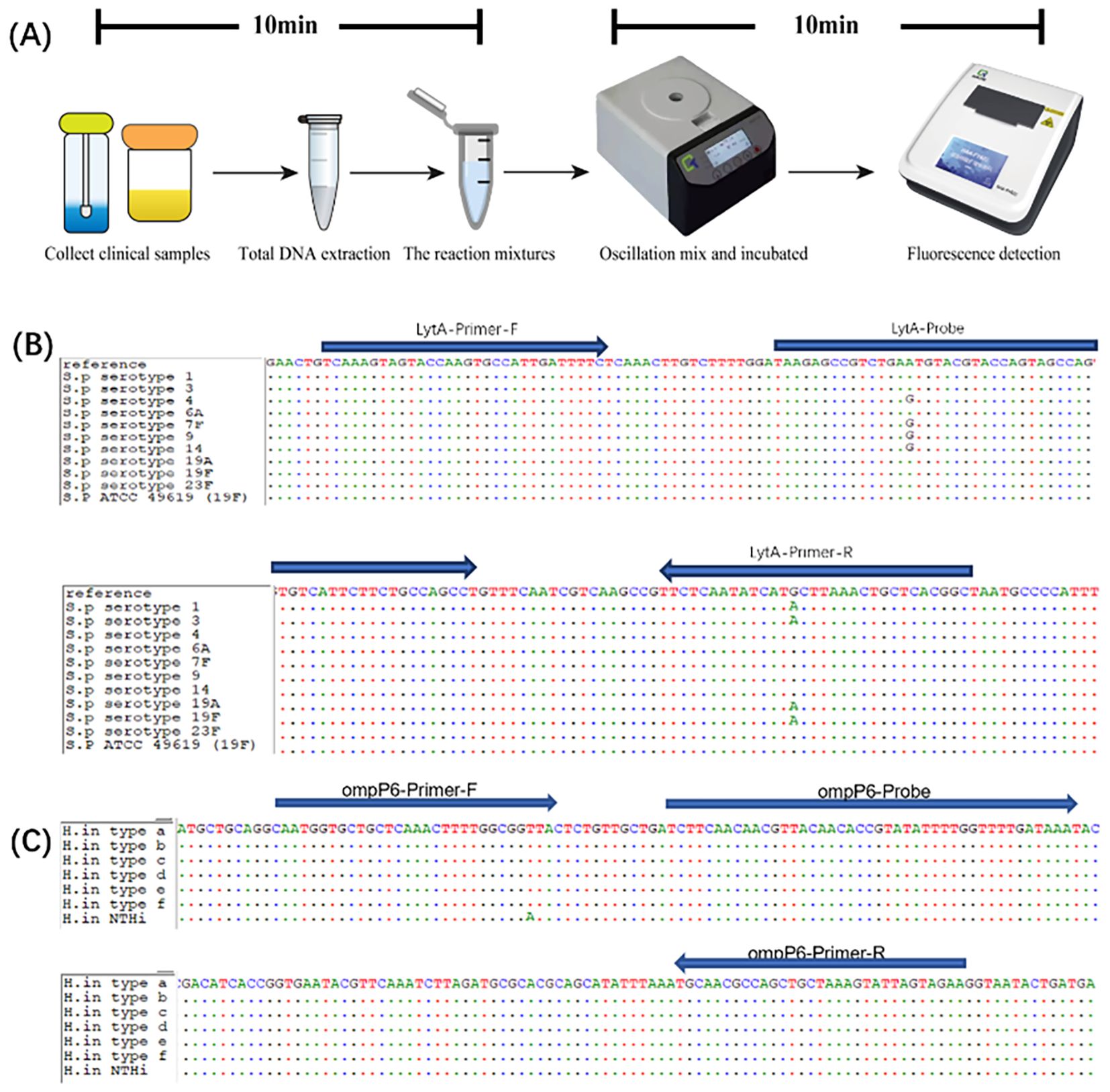 Figure 1. Establishment of the duplex recombinase-aided amplification (RAA) method. (A) Workflow of the duplex RAA method. (B) Alignment of the lytA gene among different S. pneumoniae strains, including serotype 1, type 3, type 4, type 6A, type 7F, type 9C, type 14, type 19A, type 19F, and type 23F. (C) Alignment of the omp6 gene among different H influenzae strains, including typeable (encapsulated a–f) and nontypeable (nonencapsulated) strains.