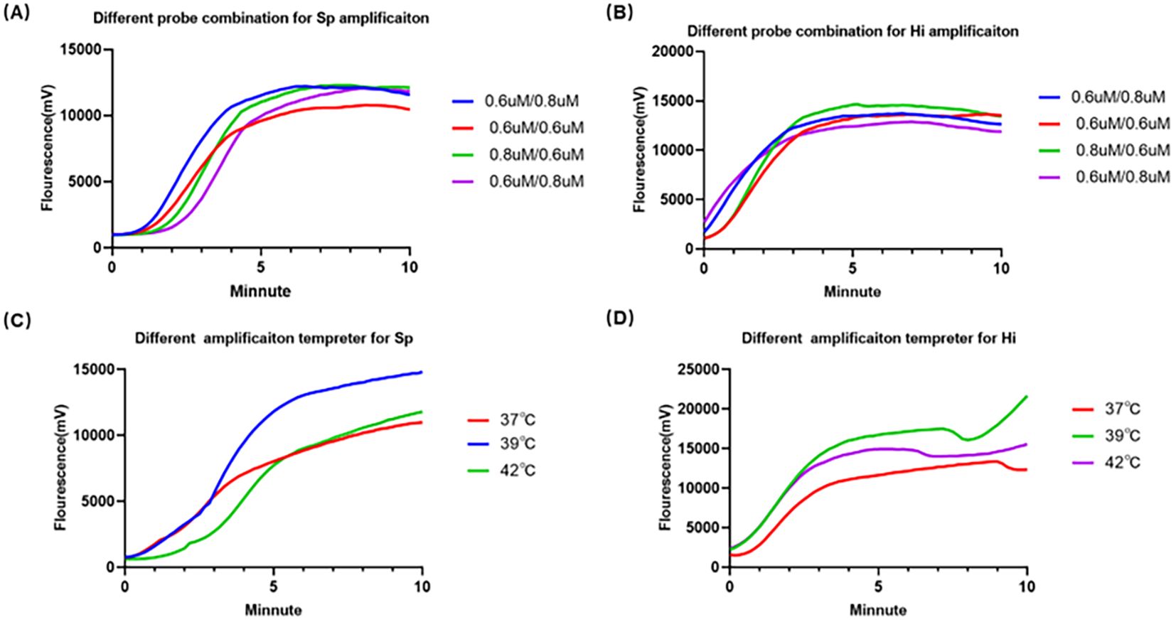 Figure 2. Optimization of the duplex RAA assay parameters. (A) Relative fluorescence curves for different RAA probe combinations for S. pneumoniae. (B) Relative fluorescence curves for different RAA probe combinations for H influenzae. (C) Relative fluorescence curves at different incubation temperatures (37°C, 39 °C,42°C for S. pneumoniae. (D) Relative fluorescence curves at different incubation temperatures (37°C, 39 °C,42°C for H influenzae.