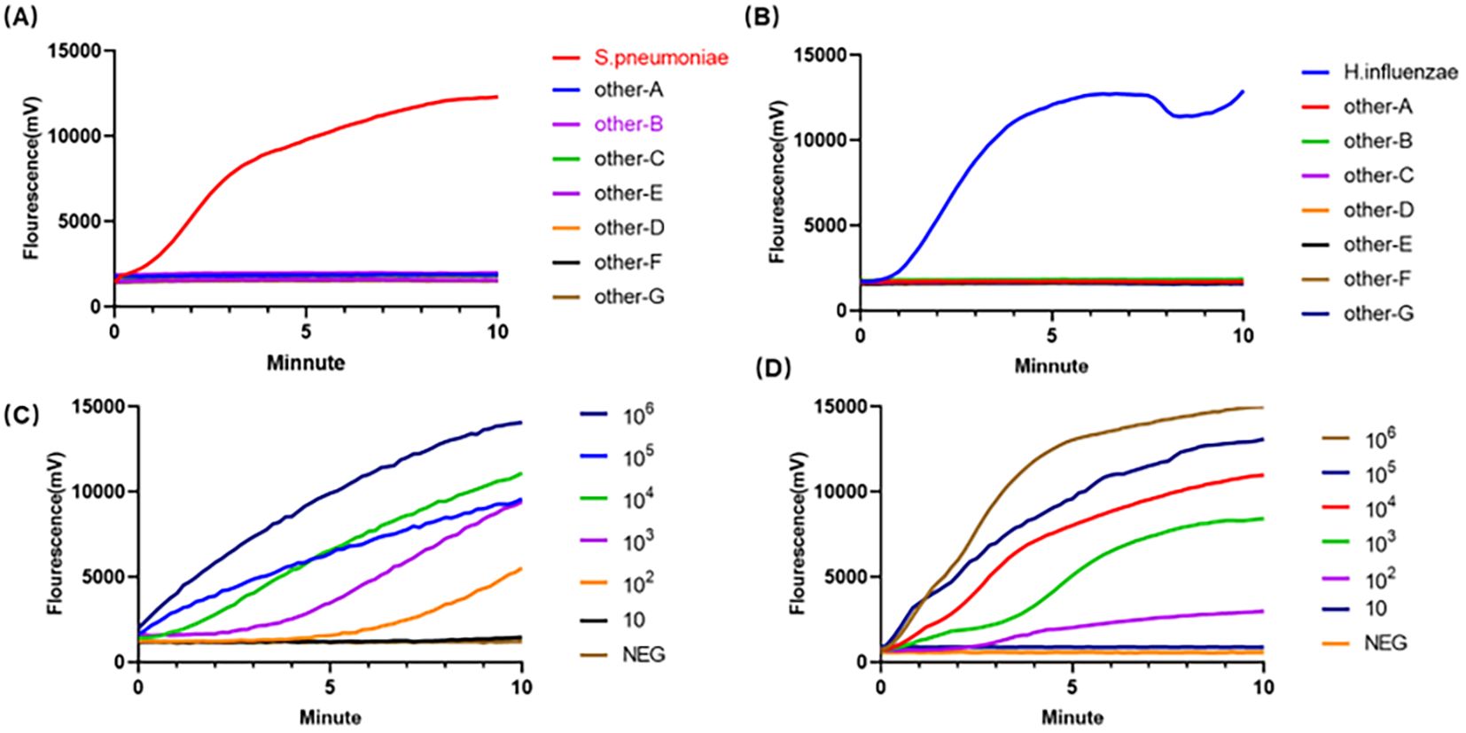 Figure 3. Specificity and sensitivity of the duplex RAA assay for S. pneumoniae and H influenzae detection. (A) Specificity of the RAA assay for S. pneumoniae. (B) Specificity of the RAA assay for H influenzae. (C) Sensitivity of the RAA assay for S. pneumoniae. (D) Sensitivity of the RAA assay for H influenzae.