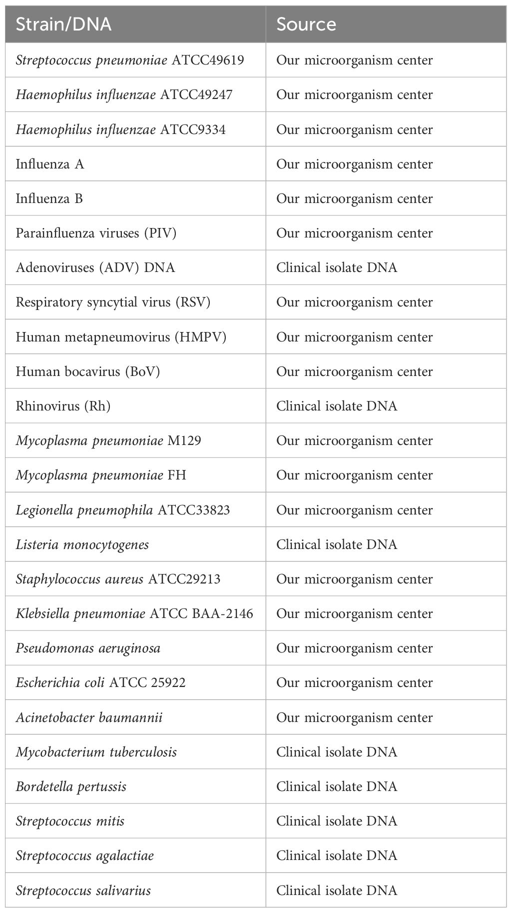 Standard reference strains of H. influenzae (non-encapsulated, ATCC 49247; and encapsulated, ATCC 9334) and S. pneumoniae (ATCC 49619) were used to establish and validate the assay. To evaluate analytical specificity, a panel of nucleic acids from common respiratory pathogens stored at the Capital Institute of Pediatrics was tested. This panel included: Mycoplasma pneumoniae, Staphylococcus aureus, Klebsiella pneumoniae, Pseudomonas aeruginosa, Escherichia coli, Legionella pneumophila, Listeria monocytogenes, Acinetobacter baumannii, Mycobacterium tuberculosis, Bordetella pertussis, Streptococcus mitis, Streptococcus oralis, Streptococcus agalactiae, Streptococcus mutans, Streptococcus parasanguinis, Streptococcus sanguinis, Streptococcus salivarius, influenza A and B viruses, parainfluenza viruses, adenoviruses, respiratory syncytial virus, human metapneumovirus, human bocavirus, and rhinovirus (Table 1).