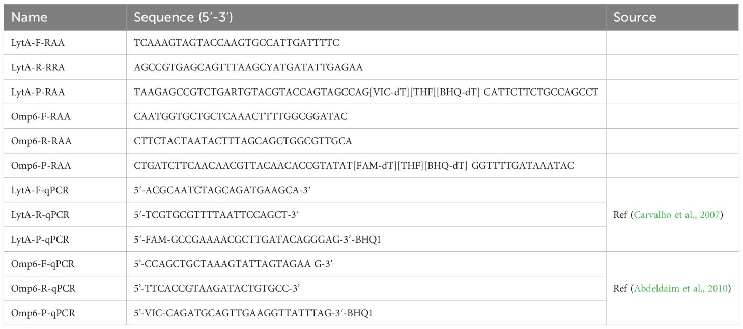 Conserved regions within the lytA gene of S. pneumoniae and the omp6 gene of H. influenzae were selected as amplification targets. Specific primers and probes were designed following the principles of the recombinase-aided amplification (RAA) assay. The specificity of all primers and probes was confirmed in silico using NCBI’s Primer-BLAST tool. Potential secondary structures, such as primer-dimers and hairpins, were analyzed using the online OligoEvaluator software. All oligonucleotides were synthesized and purified via high-performance liquid chromatography by Sangon Biotech (Shanghai, China).