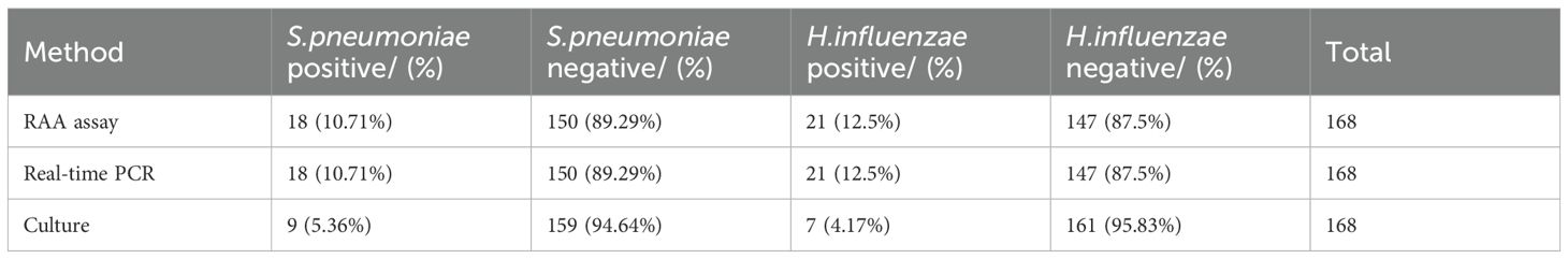 Table 3. Comparison of RAA assay, real-time PCR and culture for S.pneumoniae and H. influenzae detection of clinical samples.