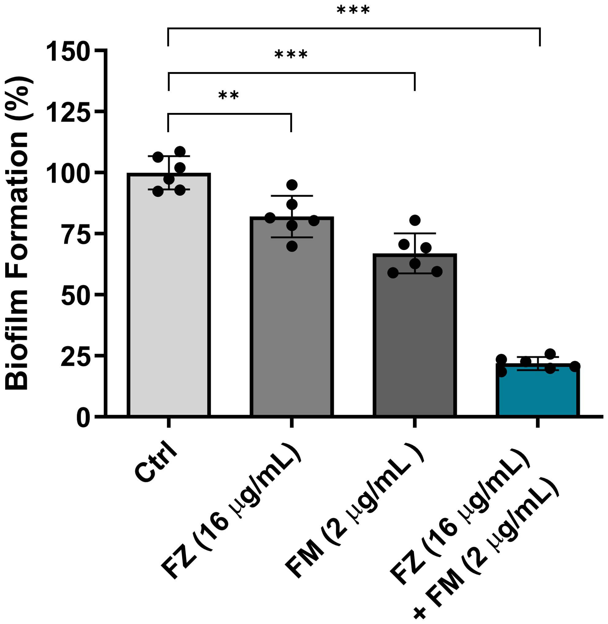The inhibitory effect of the synergistic combination of fluconazole and fingolimod on early biofilm formation was evaluated using C. auris NCCP32640 (Figure 1). Individual treatments with fluconazole and fingolimod were administered at the concentrations used in the synergistic combination. When applied alone, fluconazole and fingolimod inhibited biofilm formation by approximately 17% and 33%, respectively. By contrast, their combination significantly inhibited early biofilm formation by up to 78%.