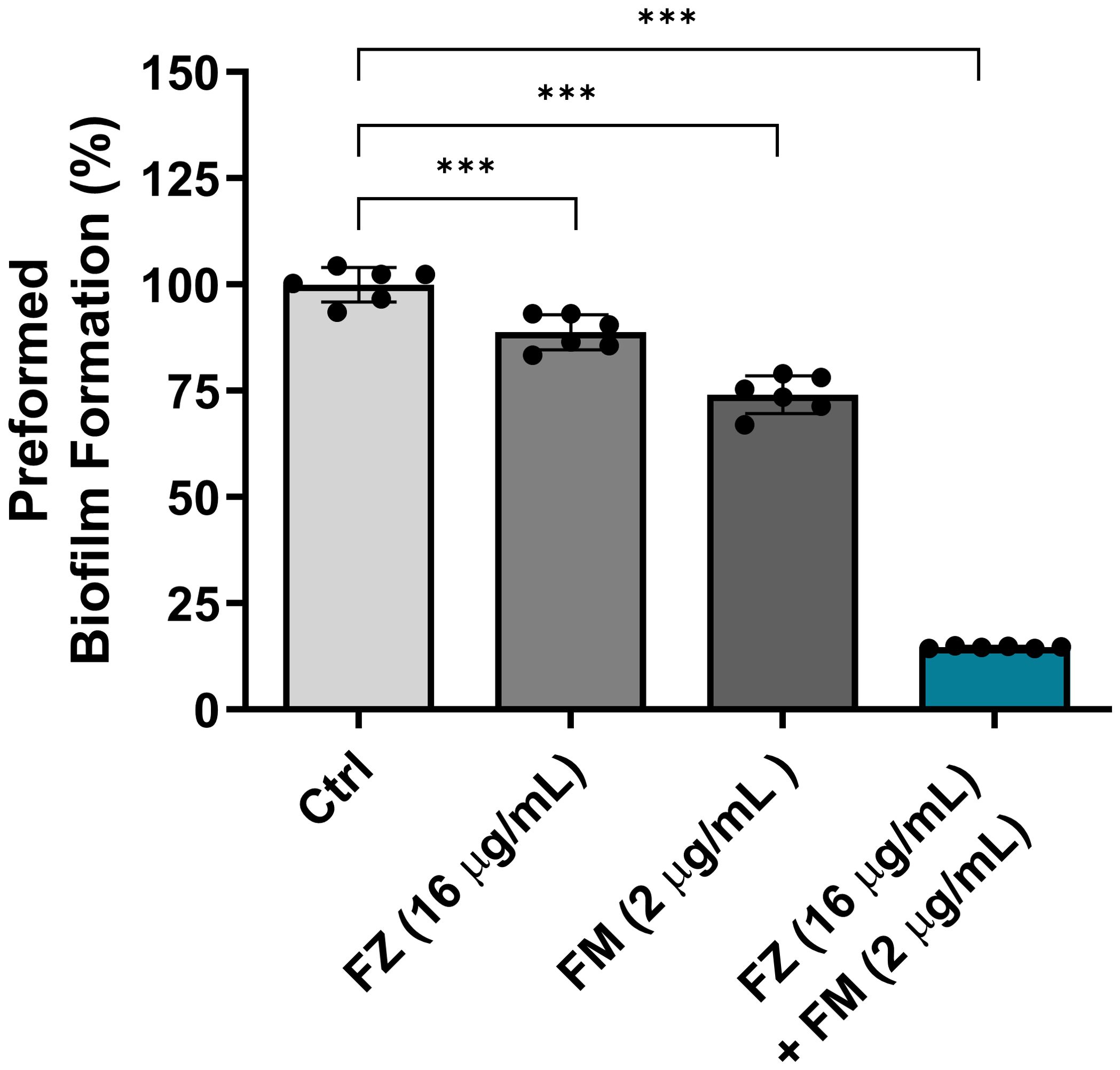 Figure 2. Eradication effect of fluconazole (FZ) and fingolimod (FM) on preformed biofilms of C. auris NCCP32640. The fungal suspensions were incubated for 24 h to allow biofilm formation, washed with PBS and treated with FZ and/or FM. The remaining biofilms were stained with 0.5% crystal violet, and absorbance was measured at 595 nm. Positive control (Ctrl) contains 2% DMSO. Statistical significance was assessed relative to the untreated control, with significant differences indicated by asterisks (***p ≤ 0.001). Data are presented as the mean ± standard deviation (SD), and error bars represent the SD.