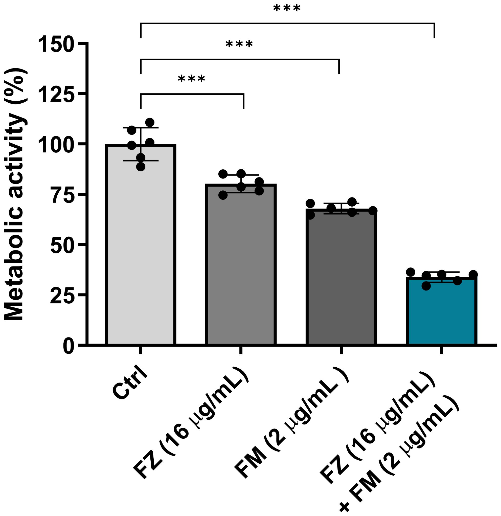 Figure 3. Antifungal effect of fluconazole (FZ) and fingolimod (FM) on the metabolic activity of C. auris NCCP32640 in biofilms. Metabolic activity was quantitatively analyzed by measuring the color changes resulting from the reduction of XTT, which reflects cell viability. Absorbance was measured at 475 and 660 nm, and values were calculated using the following formula: A475 nm (test) − A475 nm (blank) − A660 nm (test). A decrease in absorbance indicates reduced metabolic activity in C. auris and an enhanced antifungal effect. Positive control (Ctrl) contains 2% DMSO. Statistical significance was assessed relative to the untreated control, with significant differences indicated by asterisks (***p ≤ 0.001). Data are presented as the mean ± standard deviation (SD), and error bars represent the SD.