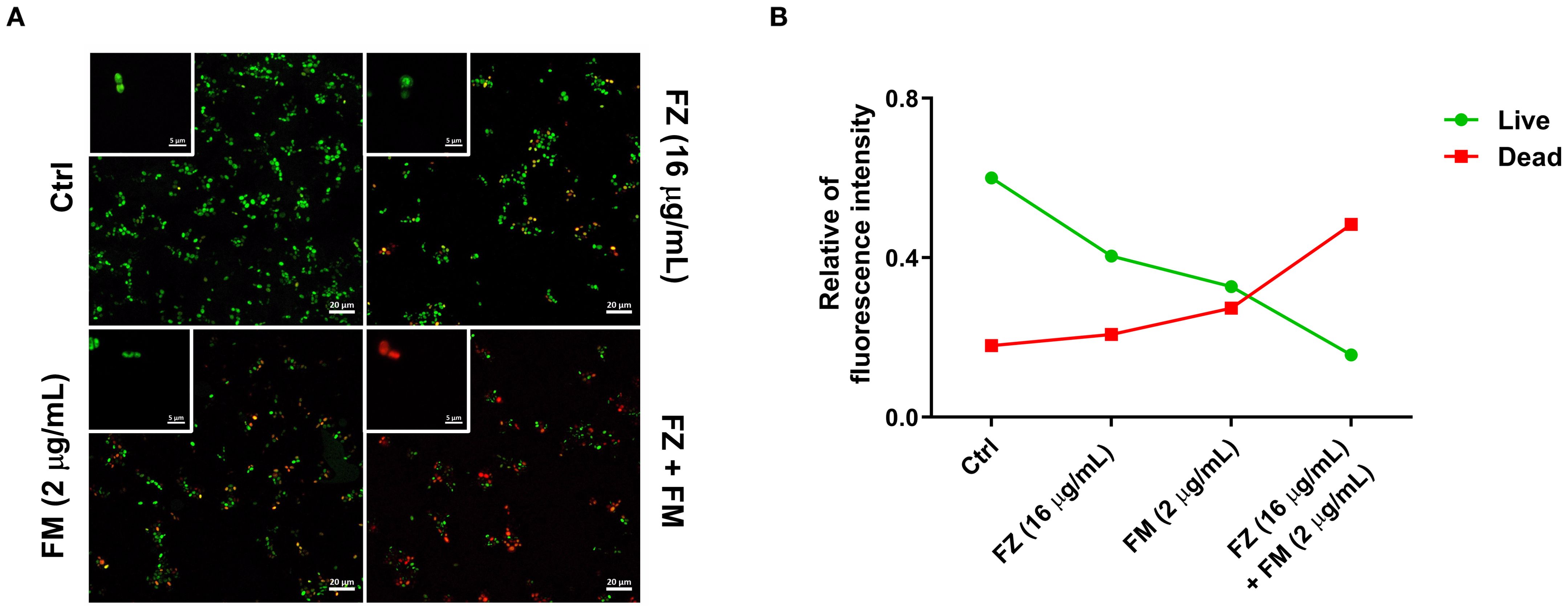Figure 4. (A) CLSM images presenting cell viability within C. auris NCCP32640 biofilms after treatment with fluconazole (FZ) and fingolimod (FM). Live cells (green) and dead cells (red) were distinguished using LIVE/DEAD staining with SYTO9 and propidium iodide, respectively. Images were captured at ×40 and ×1000 magnification (scale bar, 20 µm). (B) Quantitative analysis of the relative fluorescence intensity comparing the ratio of live cells to dead cells based on the CLSM images.