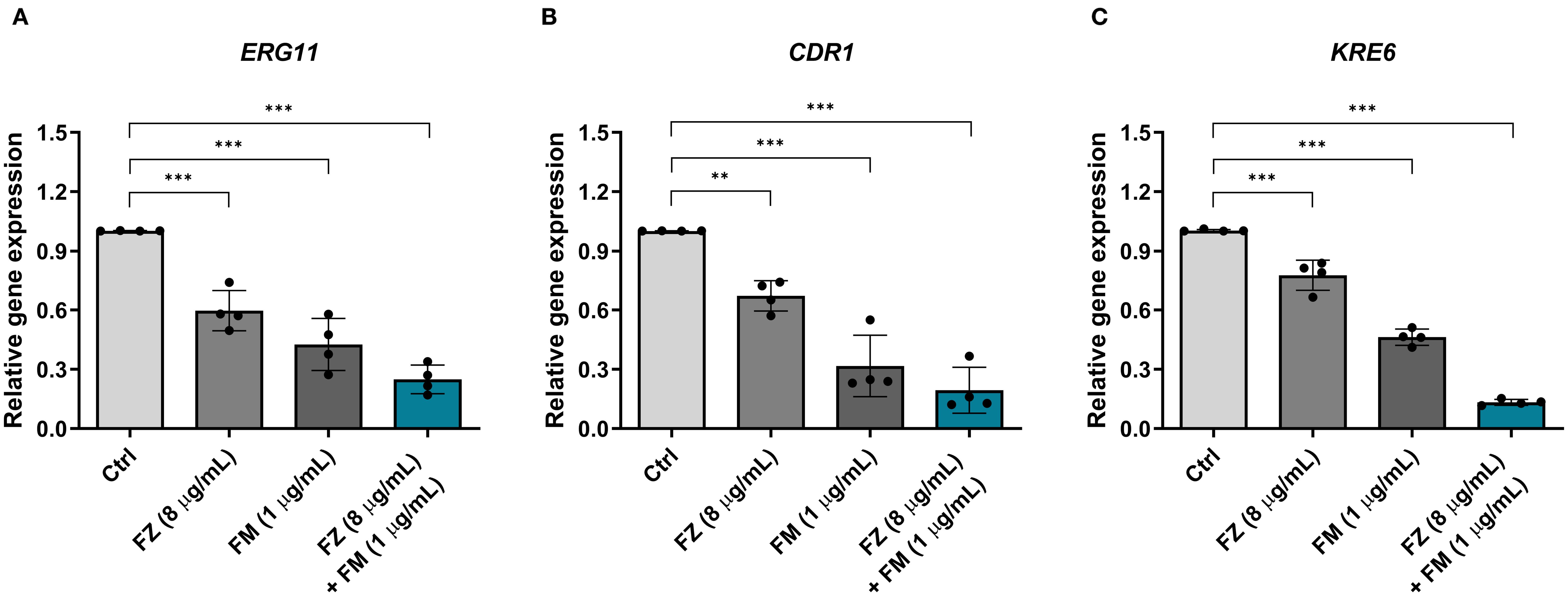 Figure 5. Relative expression of virulence-related genes in C. auris NCCP32640 treated with subinhibitory concentrations of fluconazole (FZ) and fingolimod (FM). The relative expression of (A) the azole resistance gene ERG11, (B) efflux pump gene CDR1, and (C) ECM-associated gene KRE6 was analyzed. The expression of target genes was normalized to the expression of ACT1 as an internal control. Positive control (Ctrl) contains 2% DMSO. Asterisks (*) indicate statistically significant differences compared with the control (**p < 0.01, ***p < 0.001). Data are presented as the mean ± standard deviation (SD), and error bars represent the SD.