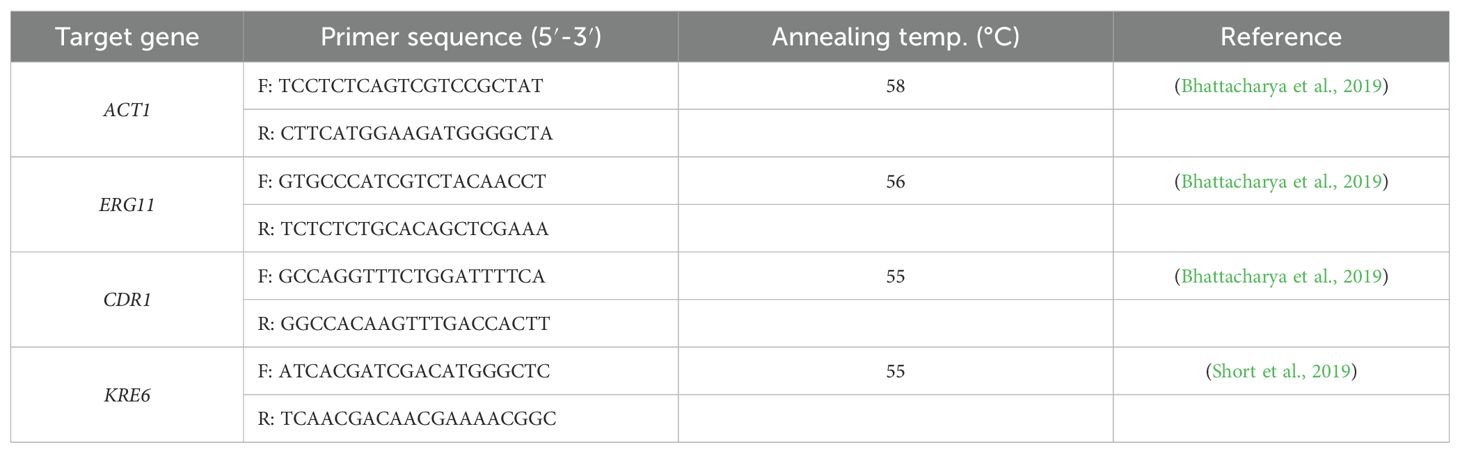 FRCA, fluconazole-resistant C. auris; ECM, extracellular matrix; MIC, minimum inhibitory concentration; EUCAST, European Committee on Antimicrobial Susceptibility Testing; FIC, fractional inhibitory concentration; FICI, fractional inhibitory concentration index; BIC, biofilm inhibition concentration; BEC, biofilm eradication concentration; PBS, phosphate-buffered saline; CLSM, confocal laser-scanning microscopy; qPCR, quantitative polymerase chain reaction.