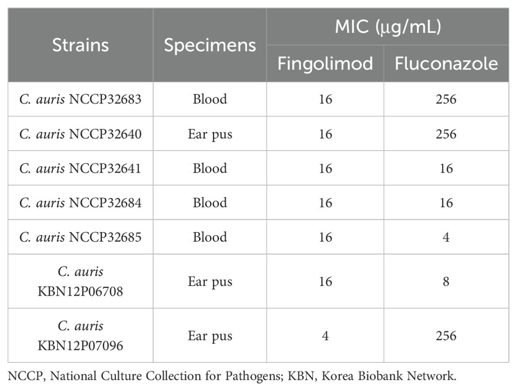Fingolimod, a derivative of the immunosuppressive metabolite myriocin, is a Food and Drug Administration-approved treatment for multiple sclerosis (Aktas et al., 2010; Castro-Borrero et al., 2012). A previous study reported that fingolimod exhibits antibacterial effect (Jin et al., 2022). However, a few studies have investigated the antifungal activity of fingolimod against C. auris. Furthermore, its potential as an adjuvant to existing antifungal agents remains largely unexplored. Therefore, we evaluated the antifungal activity of fingolimod and its combined effects with fluconazole against fluconazole-resistant C. auris (FRCA).