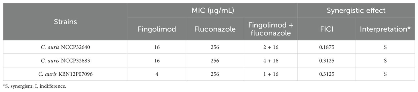 Table 3. Synergistic effects of fingolimod and fluconazole against fluconazole-resistant C. auris strains.