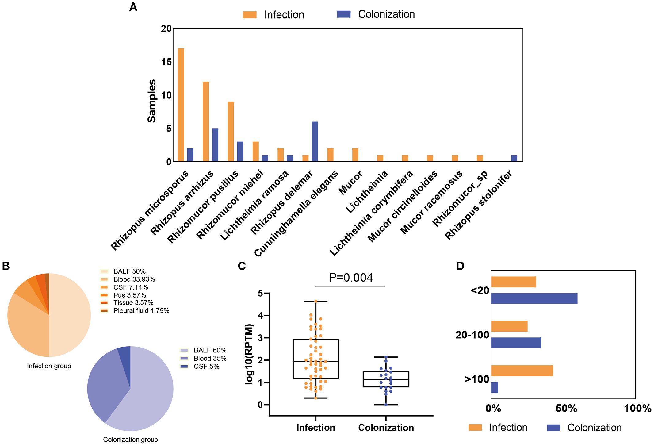Figure 1. Distribution and abundance of Mucorales species in patients with Mucorales infection and colonization. (A) Comparison of Mucorales species in patients with Mucorales infection and colonization. (B) Distribution of sample types in patients with Mucorales infection and colonization. (C) Differences in mNGS RPTM for Mucorales in patients with Mucorales infection and colonization. (D) Proportion of patients with different mNGS Mucorales reads in the infection and colonization groups.