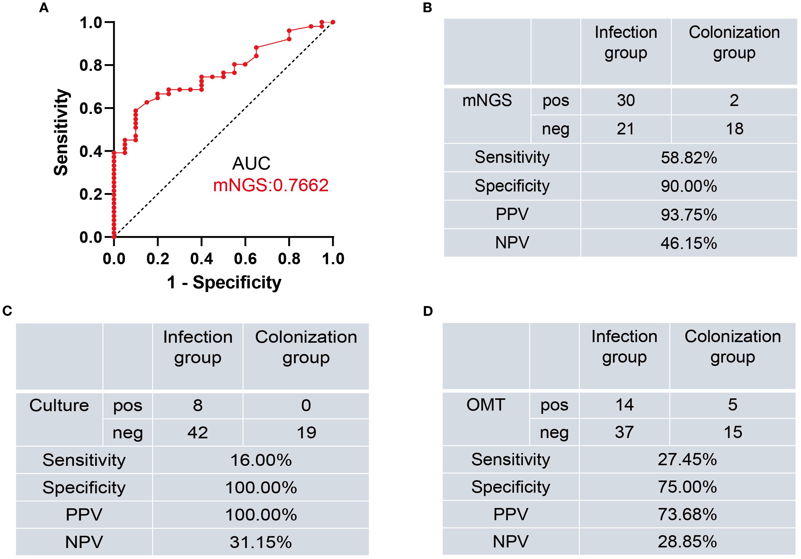 Figure 2. Diagnostic performance of mNGS, Culture, and OMT methods for distinguishing Mucorales infection from colonization. (A) ROC curve of mNGS for discrimination between Mucorales infection and colonization. (B–D) Diagnostic performance of mNGS (B), Culture (C), and OMT (D) methods for differentiating between Mucorales infection and colonization. AUC, area under curve; PPV, positive predictive value; NPV, negative predictive value; pos, positive; neg, negative.