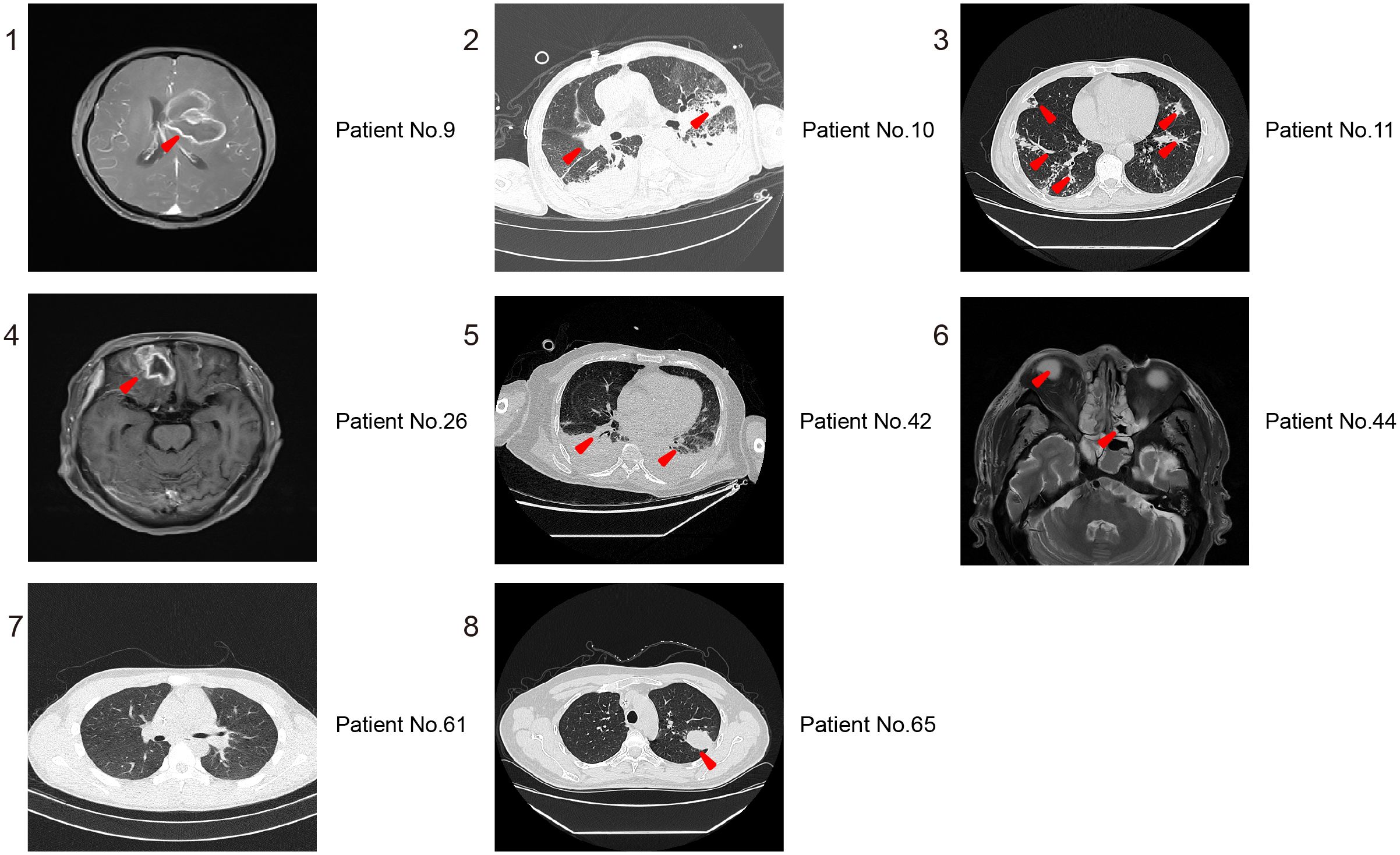 Figure 3. Representative imaging results for distinguishing Mucorales infection from colonization. 1,4, and 6 are MRI of Brain; 2, 3, 5, 7, and 8 are CT of lung. The red arrowheads showed the abnormal lesions.