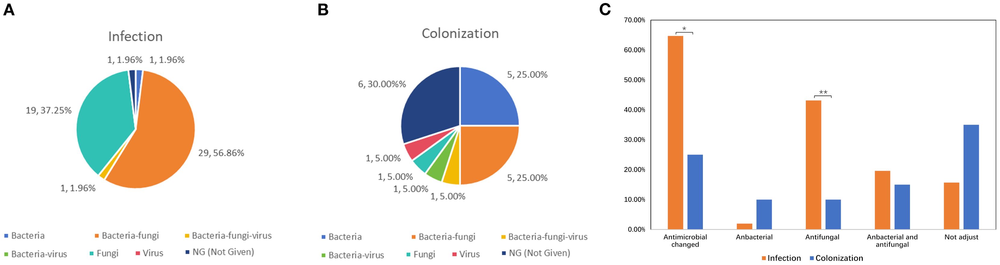 Figure 4. Impacts of mNGS on antimicrobial adjustment in patients with Mucorales infection and colonization. (A, B) The infection types of patients with Mucorales infection (A) and colonization (B). (C) Variations in antimicrobial regimens of antibacterial and antifungal agent before and after mNGS detection. *P < 0.05, **P < 0.01.