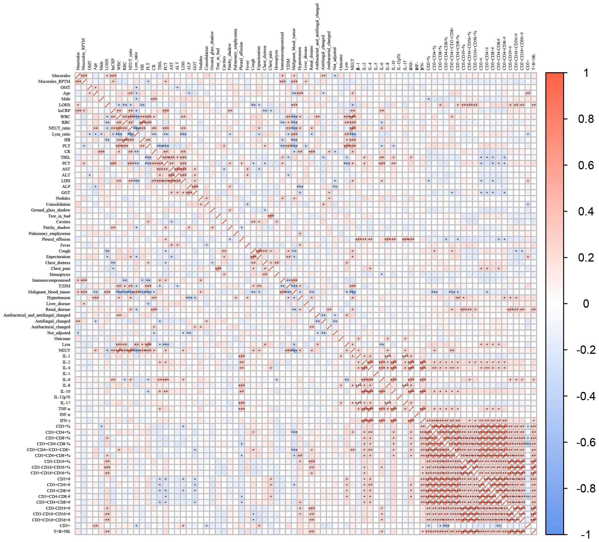 We conducted Spearman correlation analyses to examine the relationship between various characteristics and Mucorales infection. The results showed significant positive correlations between Mucorales infection and the following variables: Mucorales RPTM value, LOHS, hsCRP, immunocompromised, malignant blood tumor, and antifungal changed. Significant negative correlations between Mucorales infection and not adjust drug level were observed. Additionally, significant positive correlations were observed between Mucorales RPTM value and the following variables: hsCRP, PCT, immunocompromised, malignant blood tumor, and liver disease. Notably, OMT Mucorales positivity was positively correlated with age, and CD3+ index; and negatively correlated with lymphocyte ratio and Alanine Aminotransferase (ALT). Furthermore, positive correlations were found between LOHS and the following variants: B cells, NK cells and NKT cells. Pleural effusion was significantly positive with IL-1, IL-2, IL-4, IL-6, IL-8, IL-17, and TNF-α (Figure 5).