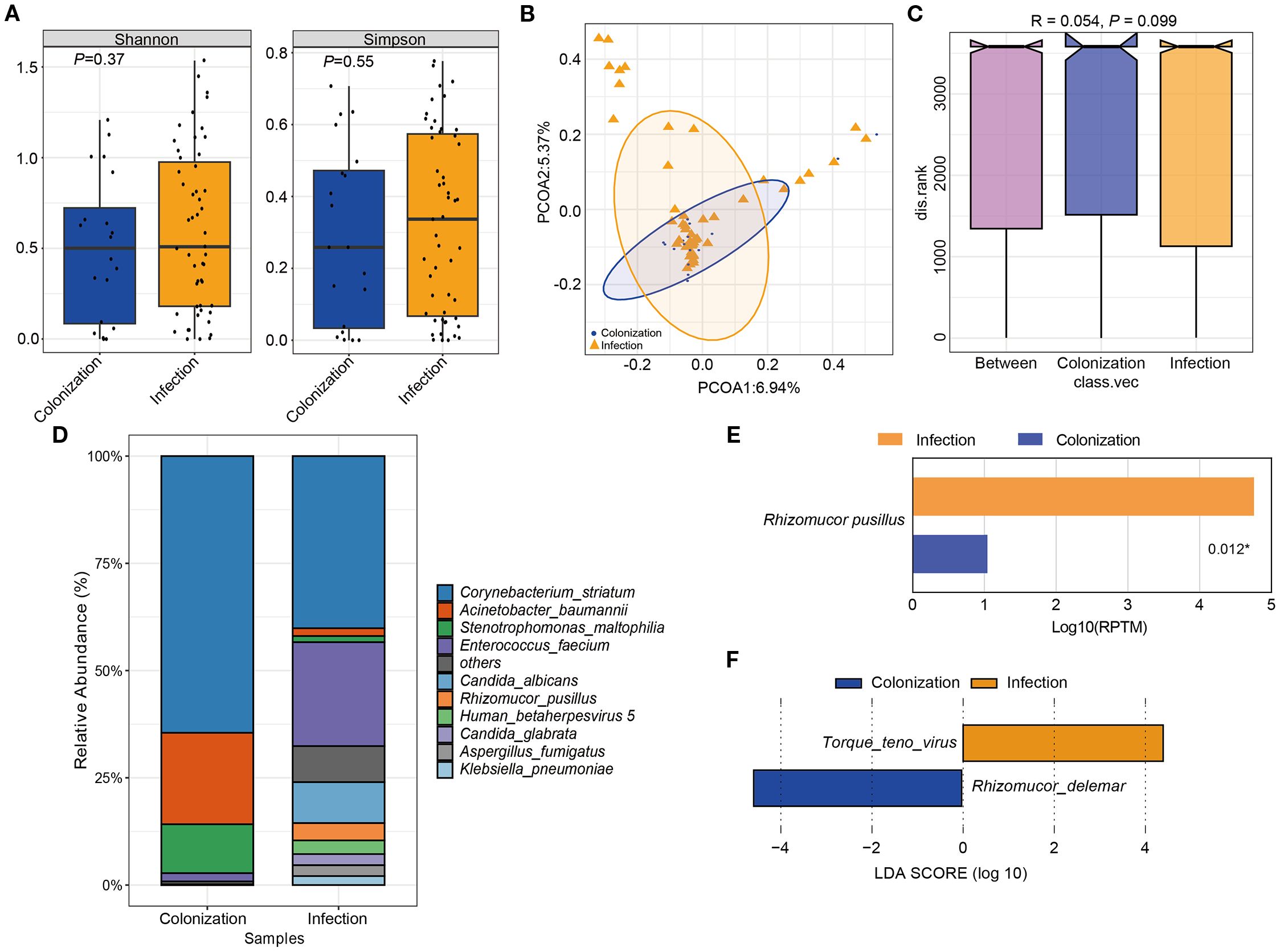 Figure 6. The difference of microbial composition for patients with Mucorales infection and colonization. (A) Alpha diversity was showed by Shannon and Simpson index. (B) PCoA analysis of the microbial composition. (C) ANOSIM for the analysis of microbial community structure. (D) Barplot showed the top 10 species with the highest abundance between two groups. (E) Significant different analysis of the species between two groups with Kruskal-Wallis test. (F) Lefse analysis for enriched species for the two groups. P < 0.05.
