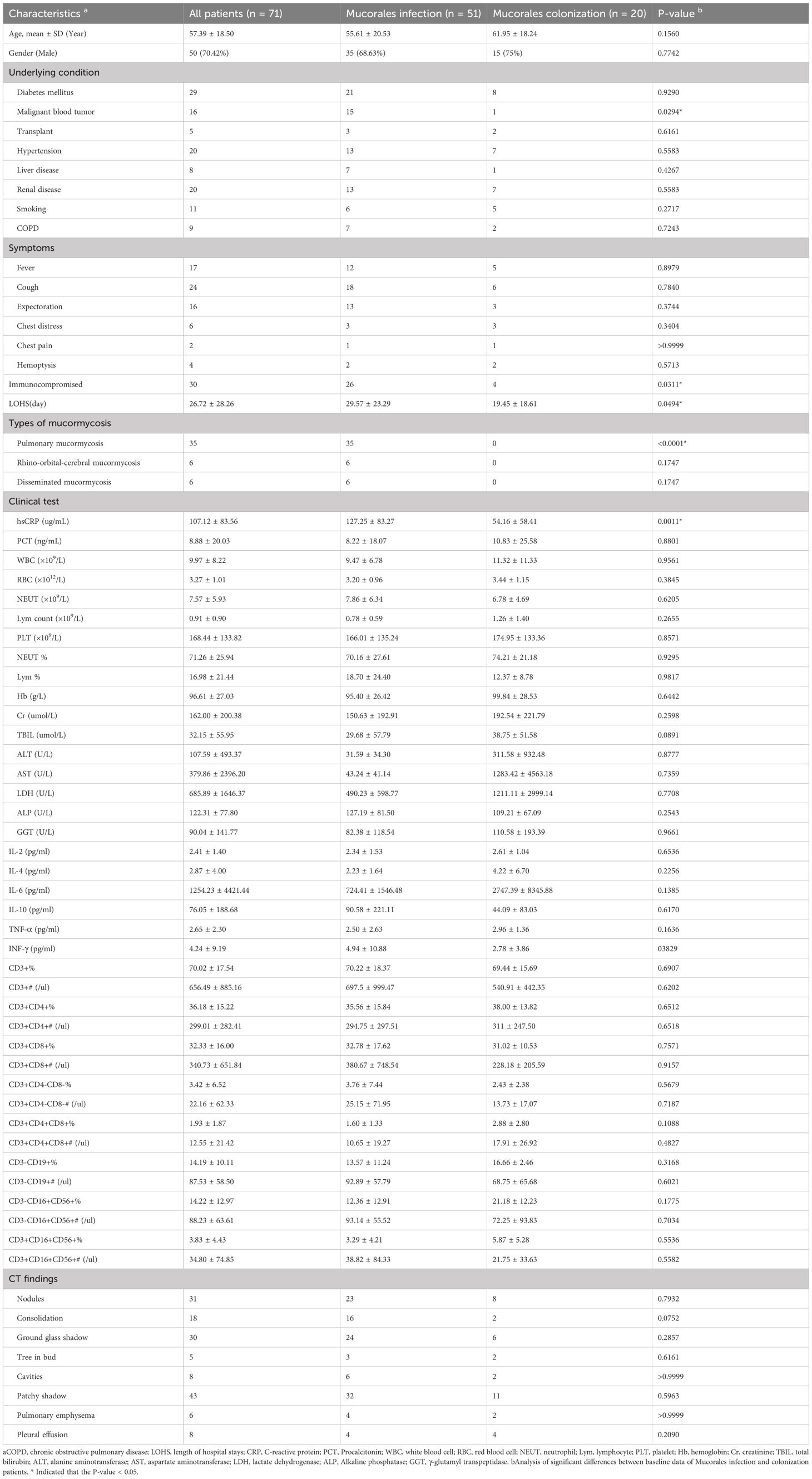 Totally, 71 patients were included and diagnosed as proven (n = 3), probable (n = 48) and possible (n = 20) mucormycosis. Among them, 51 were identified as Mucorales infection, and 20 were colonization group.