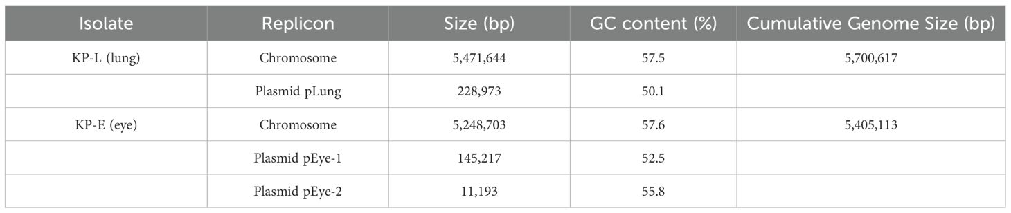 Bacterial isolation and species identification: Clinical isolates of K. pneumoniae were obtained from the patient’s BALF (representing the lung infection) and from infected tissue collected during left eye enucleation (representing the endophthalmitis). BALF (5 mL) was centrifuged at 3,000 × g for 10 min at 4°C and the pellet resuspended in 0.5 mL sterile normal saline; ocular tissue (~100 mg) was aseptically minced, homogenized in 1 mL sterile normal saline, then centrifuged at 2,000 ×g for 5 min and the supernatant used for plating. Processed material from both specimens was inoculated onto Columbia blood agar and MacConkey agar (Chongqing Ponton Medical Devices Co., Ltd., Chongqing, China) and incubated at 37°C in 5% CO2 for 24–48 h with inspections at 24 h and 48 h. Colonies with morphology typical of K. pneumoniae (round, convex, smooth to mucoid, 2–3 mm at 24 h); Presumptive colonies from Columbia blood agar and MacConkey agar were Gram-stained (Gram-negative rods) and identified using an automated system (VITEK 2 Compact, GN identification card; bioMérieux, Marcy-l’Étoile, France), which called K. pneumoniae for both isolates. These isolates were designated lung isolate (KP-L) and eye isolate (KP-E). Antimicrobial susceptibility testing(AST) was performed by broth microdilution and interpreted according to CLSI M100 (2024) breakpoints (per-drug MICs and interpretations in Table 1). Pure cultures were stored at −80°C in glycerol stocks until DNA extraction and downstream analyses.