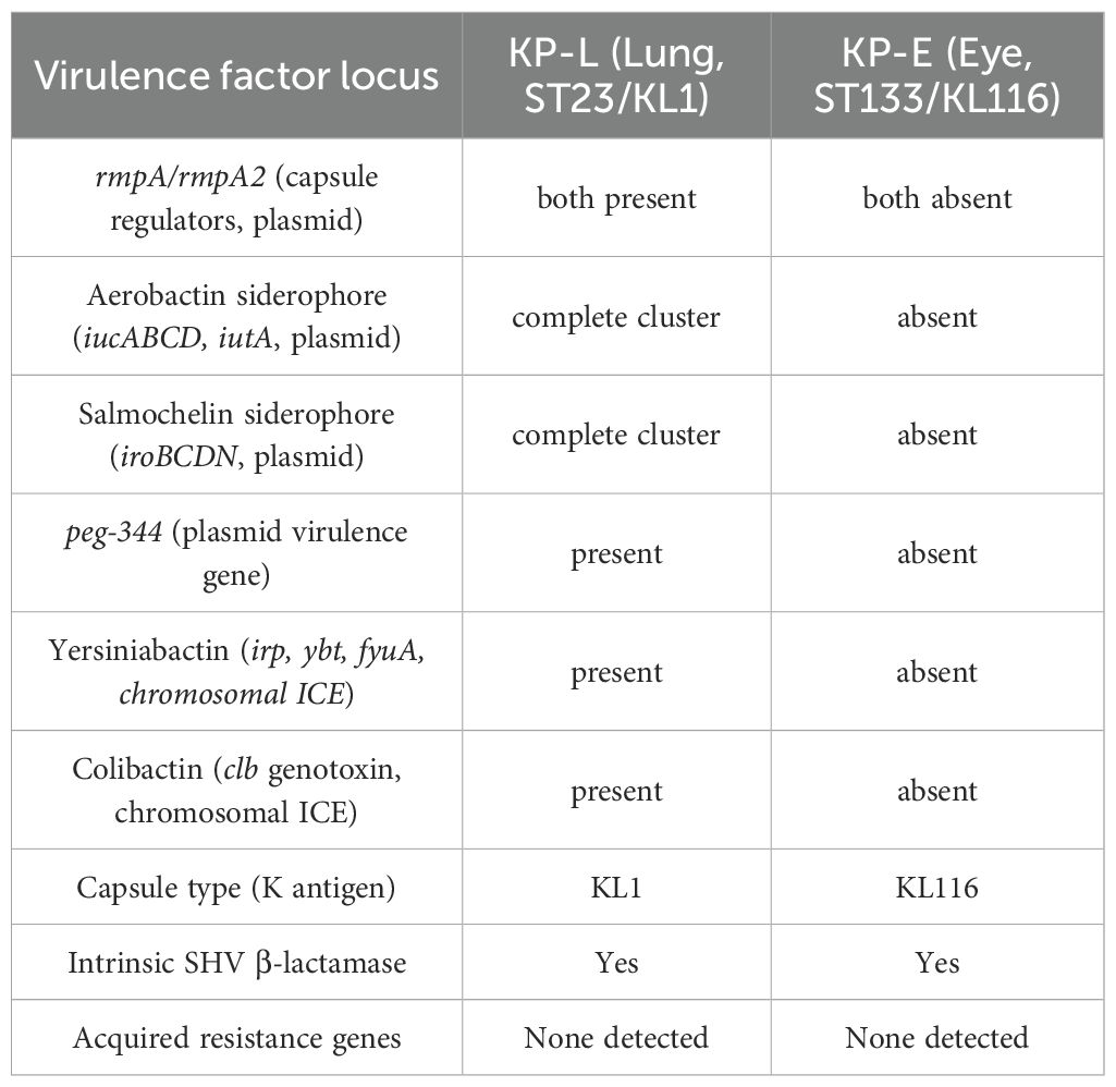 Results: The lung isolate (KP-L) belonged to the hypervirulent ST23/KL1 lineage and carried a large non-conjugative plasmid encoding rmpA, rmpA2, iuc, iro, and peg-344, together with chromosomal yersiniabactin. In contrast, the eye isolate (KP-E) was a classical ST133/KL116 strain lacking known hypervirulence markers but harboring plasmids encoding heavy-metal resistance genes. Despite the absence of hypervirulence factors, KP-E caused severe endophthalmitis requiring enucleation, underscoring the pathogenic potential of classical strains in immune-privileged sites. Comparative genomic and phylogenetic analyses confirmed that the two isolates were not clonally related.