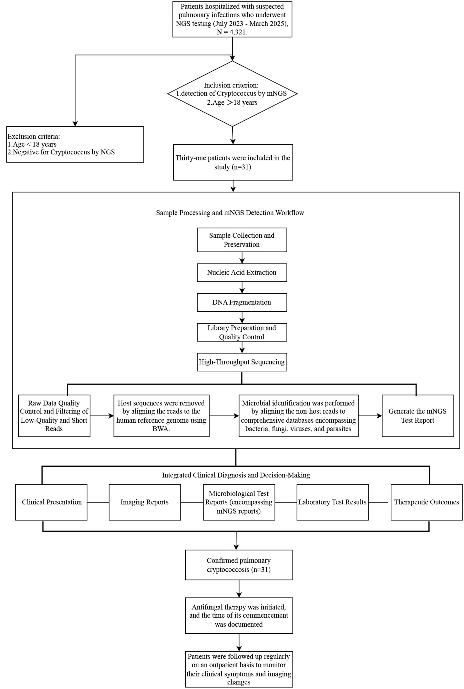 In this retrospective study, we compared mNGS with traditional pathogen detection methods and recorded changes in antimicrobial agents before and after patient examination to evaluate its value in guiding treatment decisions. Although cryptococcus pathogens can be promptly detected and taxonomically characterized via mNGS, providing critical data for guiding therapeutic strategies, validation of its impact on patient prognosis based on patient outcomes is still needed (Huang et al., 2024). The objective of this study is to evaluate the diagnostic sensitivity and clinical utility of mNGS in managing pulmonary cryptococcosis by analyzing integrated patient medical records (symptomatology, past medical history, and radiologic data) and mNGS-derived microbial profiles from 31 patients diagnosed with pulmonary cryptococcosis between July 2023 to March 2025. To clearly present the research design framework, the overall study flowchart is shown in Figure 1.