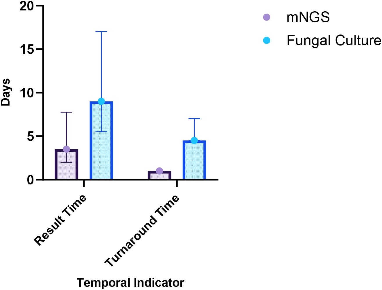 To evaluate clinical workflow efficiency, we analyzed two key time intervals. The turnaround time (TAT) was defined as the period from specimen receipt in the laboratory (T1) to the delivery of the final report to the clinician (T4). To ensure a fair and accurate comparison between fungal culture and mNGS methods, the following standardized time points were established:T1 – Specimen Receipt Time: Time of sample registration in the laboratory.T2 – Processing Start Time: Fungal culture: inoculation onto culture media; mNGS: initiation of nucleic acid extraction or sequencing.T3 – Analysis-Ready Time: Fungal culture: appearance of visible colonies allowing identification; mNGS: completion of sequencing and generation of FASTQ files.T4 – Report Issuance Time: Time when the clinical physician receives the final report. Thus, TAT was uniformly calculated as the duration from T1 to T4 for both methods. Additionally, the result time was evaluated as the interval from patient admission to the receipt of mNGS or fungal culture results. This metric reflects the time from admission to clinical decision-making based on diagnostic outcomes (Wang and Xing, 2023).