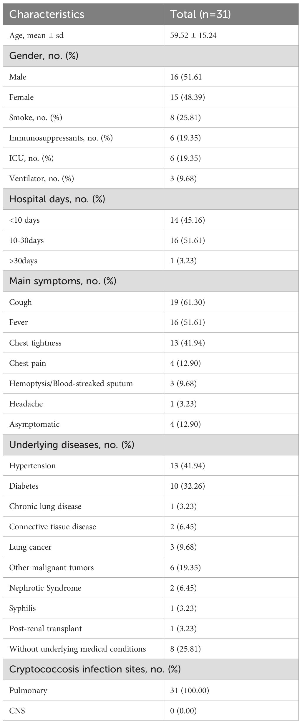 Among the 31 patients diagnosed with pulmonary cryptococcosis in this study, 16 were male (51.61%) and 15 were female (48.39%), with ages ranging from 22 to 88 years (mean age: 59.52 years). Fourteen patients (45.16%) were aged over 60. Six patients (19.35%) were admitted to the intensive care unit (ICU), with 3 (9.68%) requiring mechanical ventilation. Prior to hospitalization, six patients (19.35%) had received oral immunosuppressive therapy (glucocorticoids, tacrolimus), of these, 2 (6.45%) were admitted to the ICU (Table 1). Regarding hospitalization duration, 14 patients (45.16%) had brief hospital stays of 10 days or fewer, while 1 patient (3.23%) experienced a prolonged stay exceeding 30 days (Table 1). Four patients (12.90%) were asymptomatic. Among symptomatic individuals, the most commonly reported clinical manifestation was cough (61.30%), followed by fever (51.61%), chest tightness (41.94%), chest pain (12.90%), hemoptysis/blood-tinged sputum (9.68%), and headache (3.23%) (Table 1). Underlying medical conditions were present in 74.19% of the study population, including chronic lung diseases (such as idiopathic pulmonary fibrosis), postoperative conditions (such as lung tumors, endocrine tumors, and gynecological tumors), as well as other comorbidities (such as hypertension, diabetes, and connective tissue diseases) (Table 1). All 31 cases were diagnosed with pulmonary cryptococcosis. No cases of cryptococcal meningitis or extrapulmonary involvement were observed (Table 1).