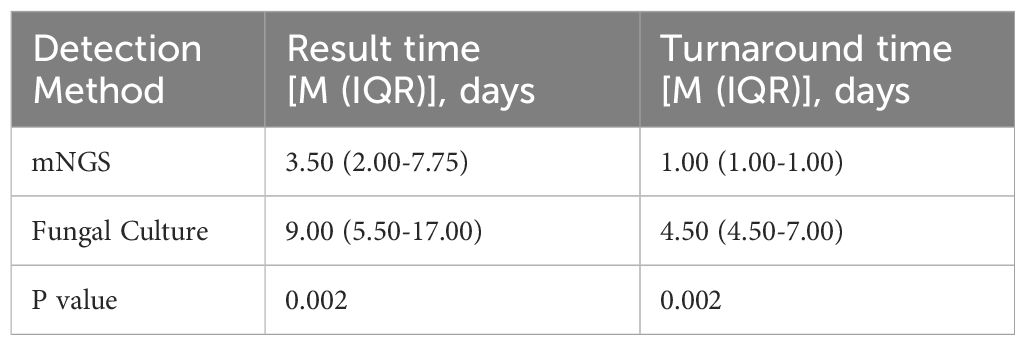 Among the 31 patients, 12 underwent both mNGS and fungal culture of BALF simultaneously, resulting in 12 paired samples for comparative analysis. The Wilcoxon signed-rank test was used to compare result time and turnaround time between the two methods, as the data were not normally distributed. Accordingly, the results are reported as median and interquartile range [M (IQR)]. As shown in Table 2, the median result time for mNGS was 3.50 days (IQR: 2.00–7.75), significantly shorter than that for fungal culture, which was 9.00 days (IQR: 5.50–17.00) (p = 0.002). Similarly, the median turnaround time for mNGS was 1.00 day (IQR: 1.00–1.00), notably less than that or fungal culture (4.50 days, IQR: 4.50–7.00) (p = 0.002) (Figure 2). These findings indicate that mNGS offers a significantly faster diagnostic timeline compared to conventional fungal culture, enhancing the timeliness of clinical decision-making.