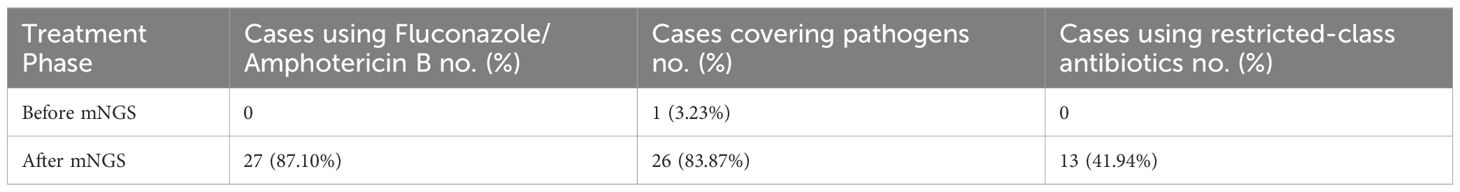 Among the 31 patients, 27 (81.10%) received fluconazole or amphotericin B lipid complex, indicating the implementation of mNGS-guided tailored therapeutic interventions. The remaining 4 patients received voriconazole as part of their post-mNGS regimen. Notably, restricted-spectrum antimicrobial agents were introduced in 13 patients (41.94%) following mNGS analysis (Table 4).
