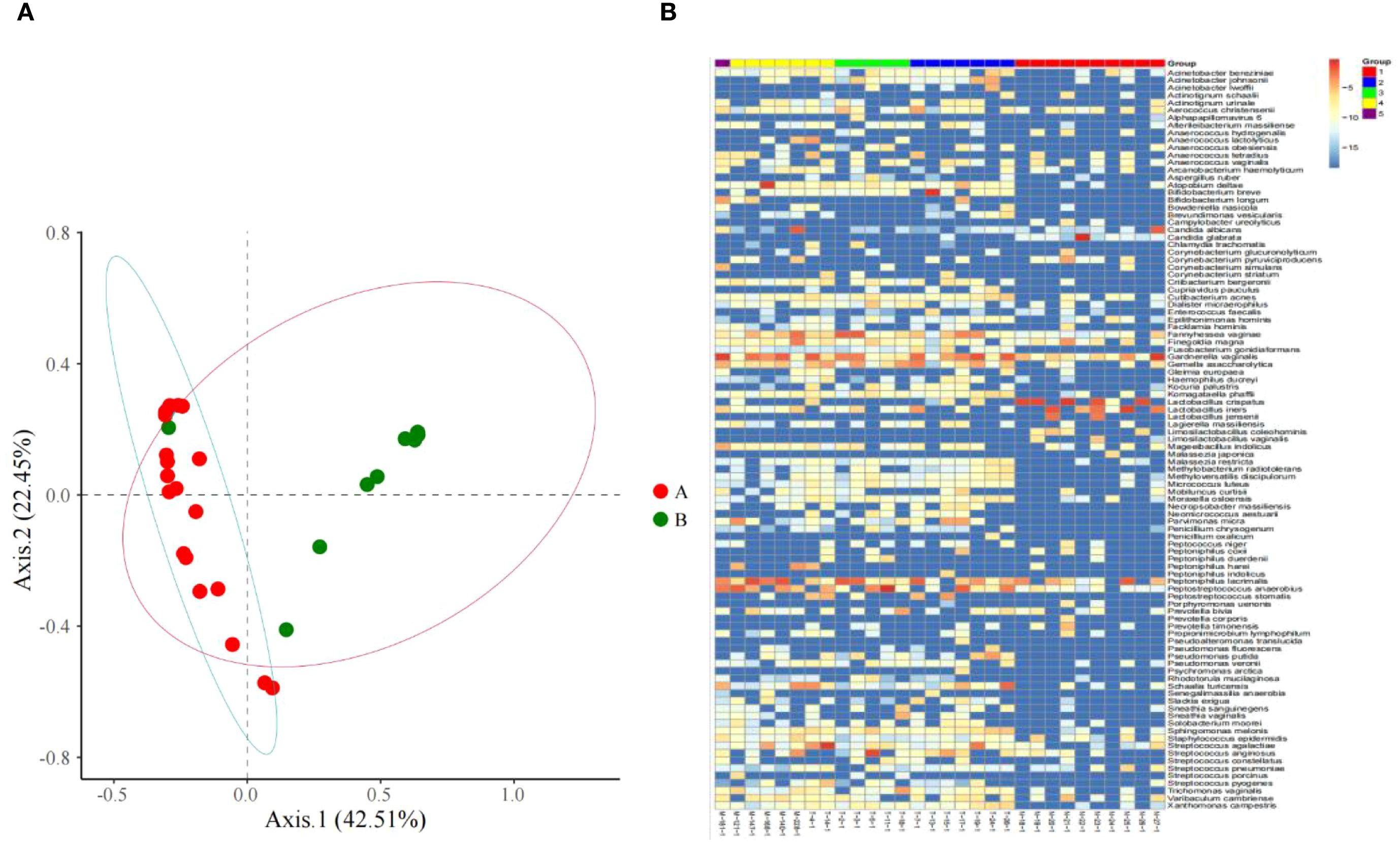 Figure 1. (A) Microbiome distribution obtained by PCoA clustering of the vaginal microbiota of all subjects; (B) Heat maps of vaginal microbiome abundance distribution and the distribution of microbial community.