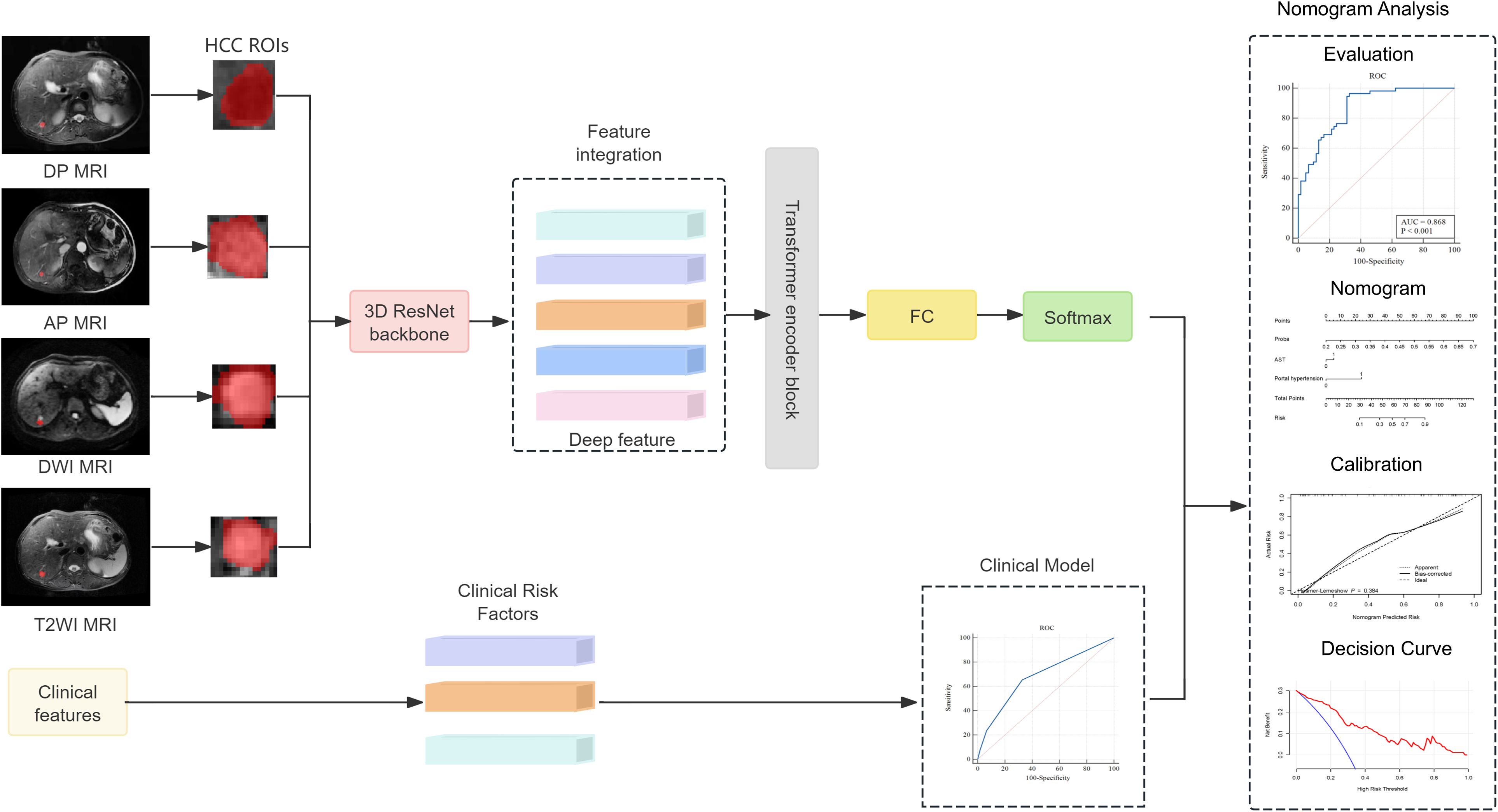 Our study has some limitations. First, this was a retrospective study. Prospective studies have better control of confounding factors and bias; therefore, we aim to design prospective studies in the future to further verify our conclusions. Second, while our external validation cohort (n=50) was well-characterized, its modest size and single-institution origin may limit its generalizability across diverse populations or imaging protocols. Multicenter validation is essential to confirm robustness, particularly for rare subtypes or borderline cases. Preliminary cross-institutional data (not included here) also suggest reproducible performance, supporting the scalability of our approach. To address this, we have initiated a prospective multicenter trial to pool data from heterogeneous sources, ensuring broader applicability. Beyond validation, seamless clinical integration is critical. We aim to develop an implementation framework to embed the nomogram as a DICOM-compatible tool within PACS, enabling automated risk score generation alongside radiology reports. Feedback from clinicians (e.g., via Likert-scale surveys) will guide usability refinements, ensuring practical utility. Regulatory considerations will also be addressed for clinical deployment. Third, in our study, the deep learning model was designed to process the ROI that encompasses the tumor, as annotated by the radiologists, allowing for image features to be learned effectively from the ROI. A key advantage of employing deep learning in radiomics analysis is its robustness to variations in boundary delineation. While inter-observer variability was not quantitatively assessed (e.g., via Dice similarity coefficient or Kappa statistics) due to the model’s resilience to such variations, future studies could incorporate such evaluations for enhanced reproducibility. Additionally, we deliberately excluded the portal venous phase (PVP) due to inconsistent image quality and a lack of standardization across retrospective datasets, thereby ensuring model reliability and generalizability. Despite this omission, our model achieved strong performance (AUCs 0.868–0.842) by effectively leveraging AP, DP, T2WI, and DWI sequences, demonstrating their sufficiency for recurrence prediction. While we acknowledge the clinical value of PVP, its exclusion was justified in this real-world study; however, in future prospective studies, we will assess its incremental benefit under standardized protocols. Finally, in China, most HCC cases were caused by HBV infection; therefore, the participants included in this study were patients with HBV-HCC. Since the prognosis of HCC is different due to different etiologies, the model needs to be further validated in patients with HCC due to other etiologies prior to its large-scale application.